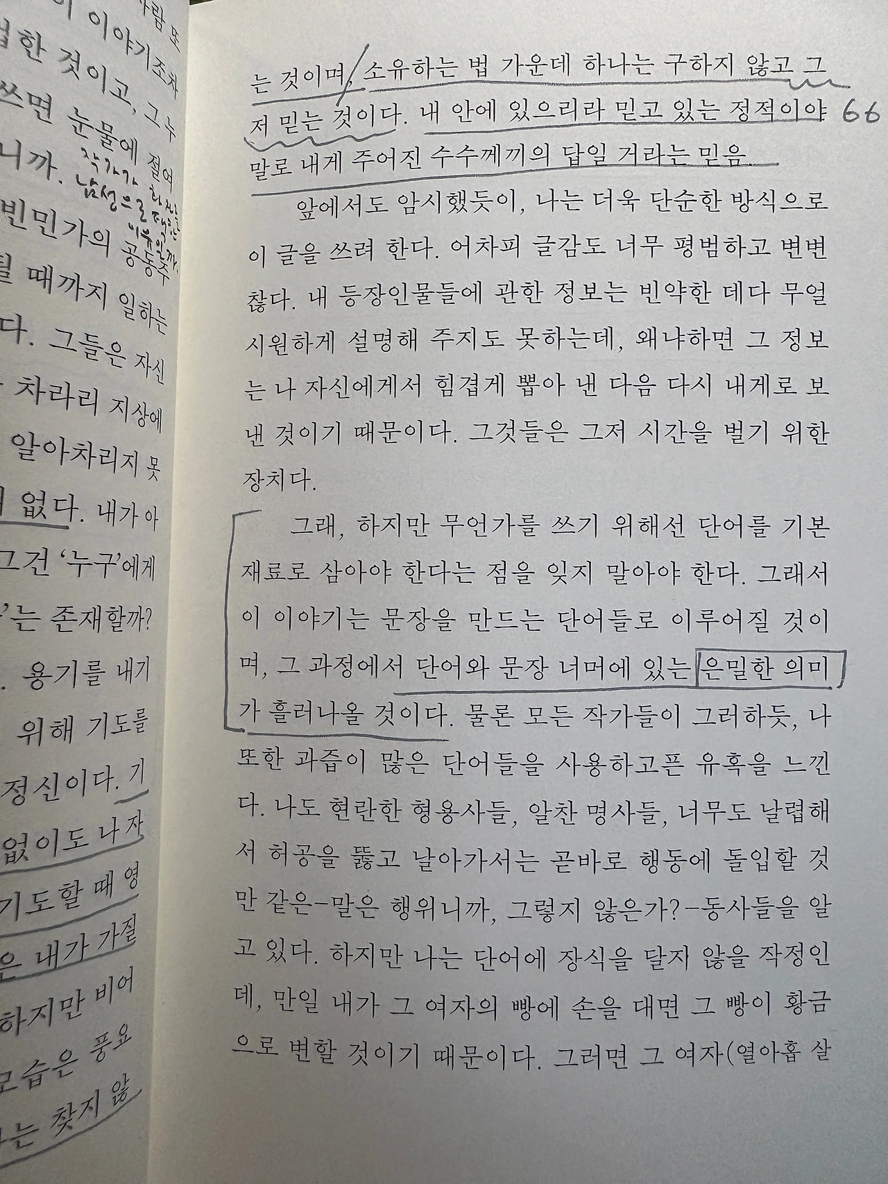 “기도는 남들의 눈에 띄지 않고서도, 아무 말 없이도 나 자신에게 도달할 수 있는 방법이었다. 나는 기도할 때 영혼을 비울 수 있었고 - 그리고 그 비어 있음은 내가 가질 수 있는 전부였다. 그 외엔 아무것도 없다. “