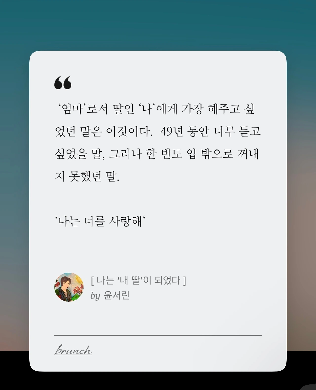 요즘도 어떤 강박에 사로잡힐 때면 나는 내 나이의 앞자리를마음에서 지우고 아홉 살의 나를바라본다. 아이에게는 다정한 손길이 필요하다. 그래서 나는 스스로 엄마가 되어서 지금의 나를 딸처럼 응원한다. ’해보고 싶은 건 지금 시작해도늦지 않아. 꾸준히 한다는 것만으로도 꽤 괜찮은 시간을 보내는 거야. 무리하지 않아도 돼. 잠은 푹 자는 게 좋아. 그리고 사람들과의 관계에 너무 상처받지 않아도 돼.’ 이렇게. 하지만 내가 ‘엄마’로서 딸인 ‘나’에게 가장 해주고 싶었던 말은 이것이다. 49년 동안 너무 듣고 싶었을 말, 그러나 한 번도 입 밖으로 꺼내지 못했던 말.