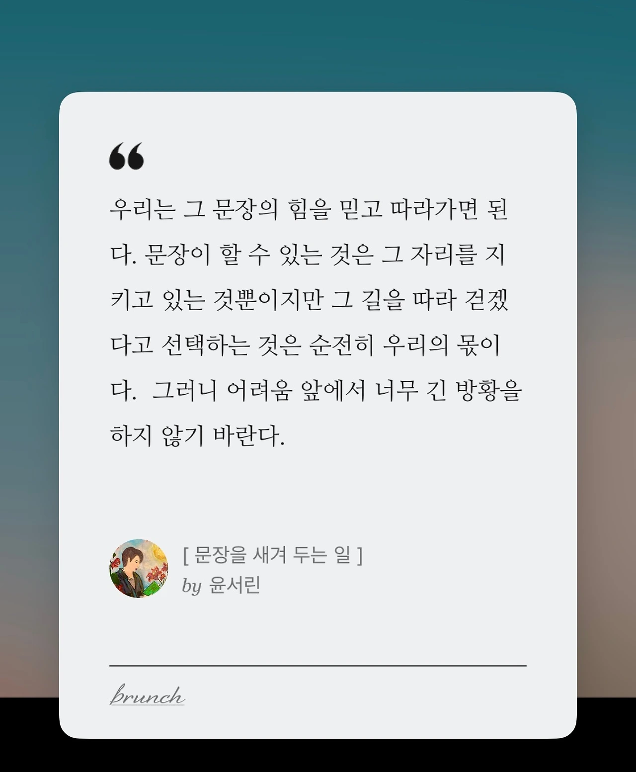 살아가면서 마음 안에 자신을 일으켜 세울 수 있는 문장 하나를 새겨두는 일은 중요하다. 우리가 깜깜한 어둠 속에 떨어졌을 때 마음 안에 새겨둔 그 문장이 은은하게 빛을 발하는 순간이 온다. 우리는 그 문장의 힘을 믿고 따라가면 된다. 문장이 할 수 있는 것은 그 자리를 지키고 있는 것뿐이지만 그 길을 따라 걷겠다고 선택하는 것은 순전히 우리의 몫이 다. 그러니 어려움 앞에서 너무 긴 방황을 하지 않기 바란다. 아무리 힘든 일도 모두 지나가는 찰나일 뿐이라는 그 사실만 잊지 않는다면 지금의 고통도 조금은 수월하게 겪고 지나갈 수 있지 않을까. 결국 모든 것은 지나가고 우리는 전보다 조금은 나아진 존재가 될 것이다.