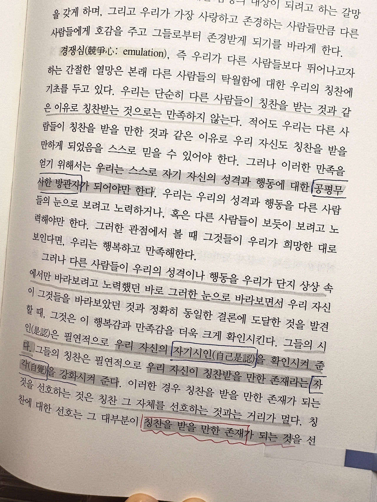 첫 부분에 인간은 칭찬 자체보다 "칭찬받을 만한 존재가 되는 것"(주 1)에 더 큰 의미를 두는 존재라는 말이 나온다.