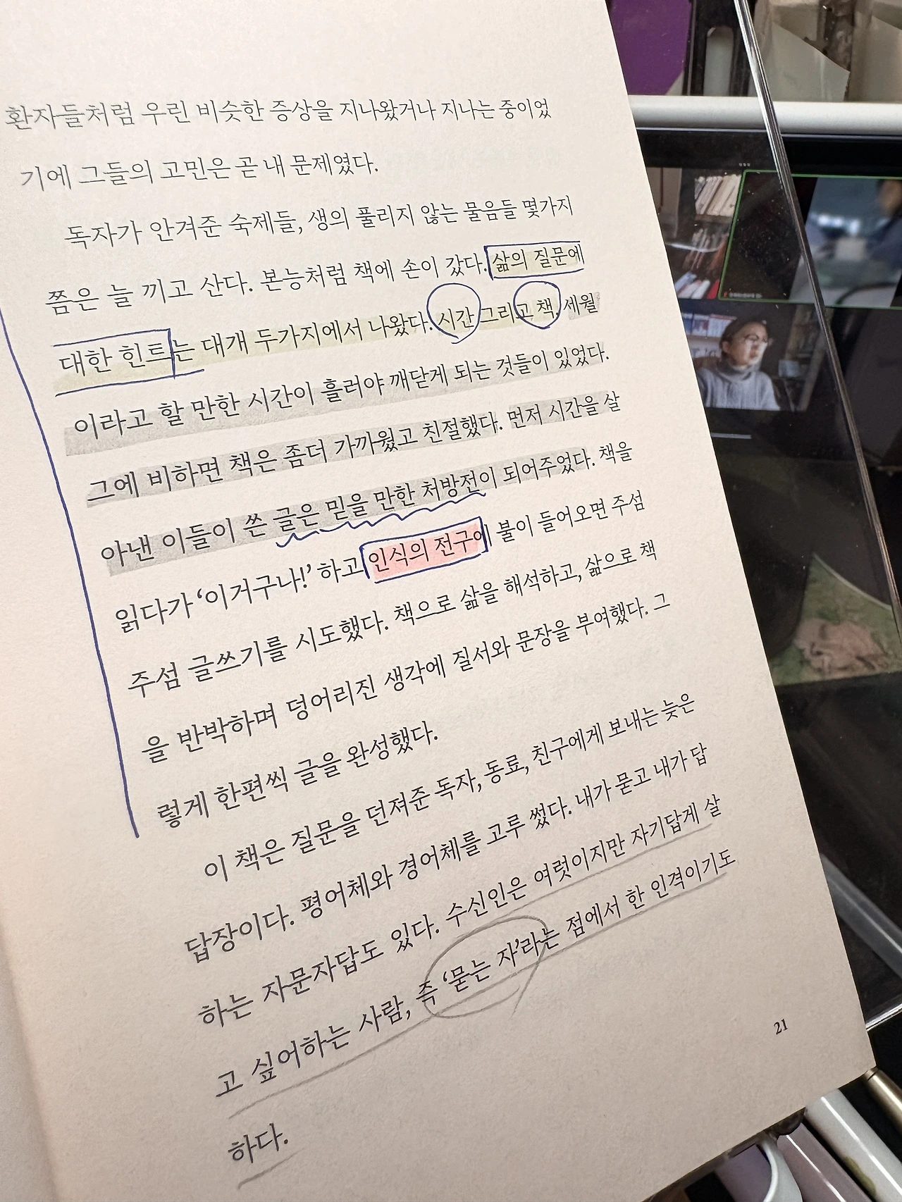 삶의 질문에 대한 힌트는 "시간"과 "책"에 있다는 작가의 말이 와닿는다. (주 3)