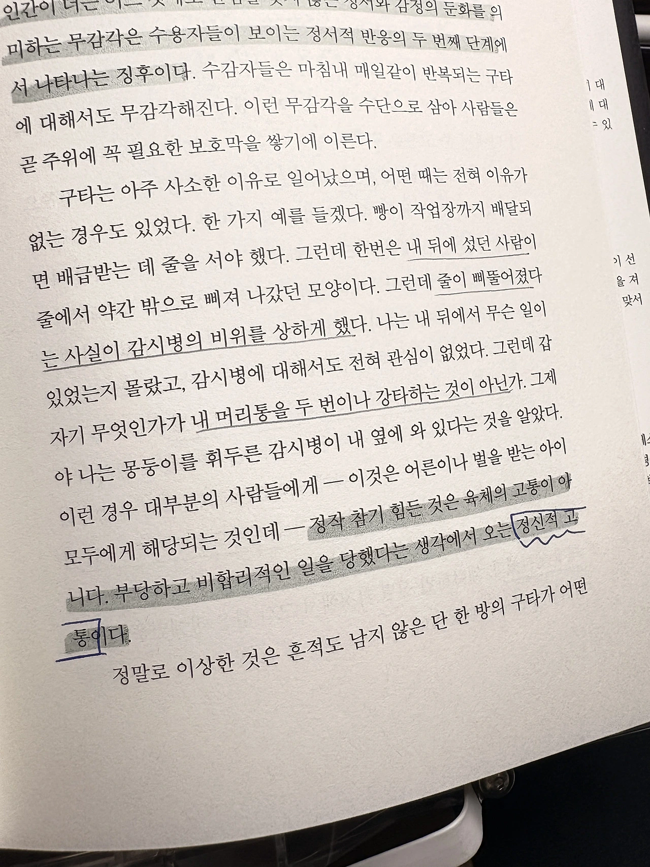 그 고통 속에서 인간이 어떤 식으로 적응하고 변화하는지에 대한 이야기를 저자를 차분히 써내려 간다.