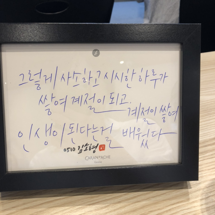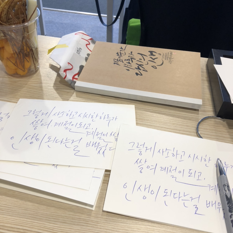손목에 힘을 너무 많이 줘서 마지막 완성본을 만들어 낼때 덜덜 떨었다. 미숙한 캘리그라피 위에 작가님이 대신 서명해주시니 그럴듯하게 완성! 보고 있으니 꽤나 만족스러웠다. 펜을 잡고 거침없이 써내려가는 작가님의 모습은 얼마나 멋지던지. 보고도 잘 써지지 않는 캘리그라피. 단시간에 어떻게 되겠냐만은 정말 쉬운 일이 아님을 느꼈습니다..