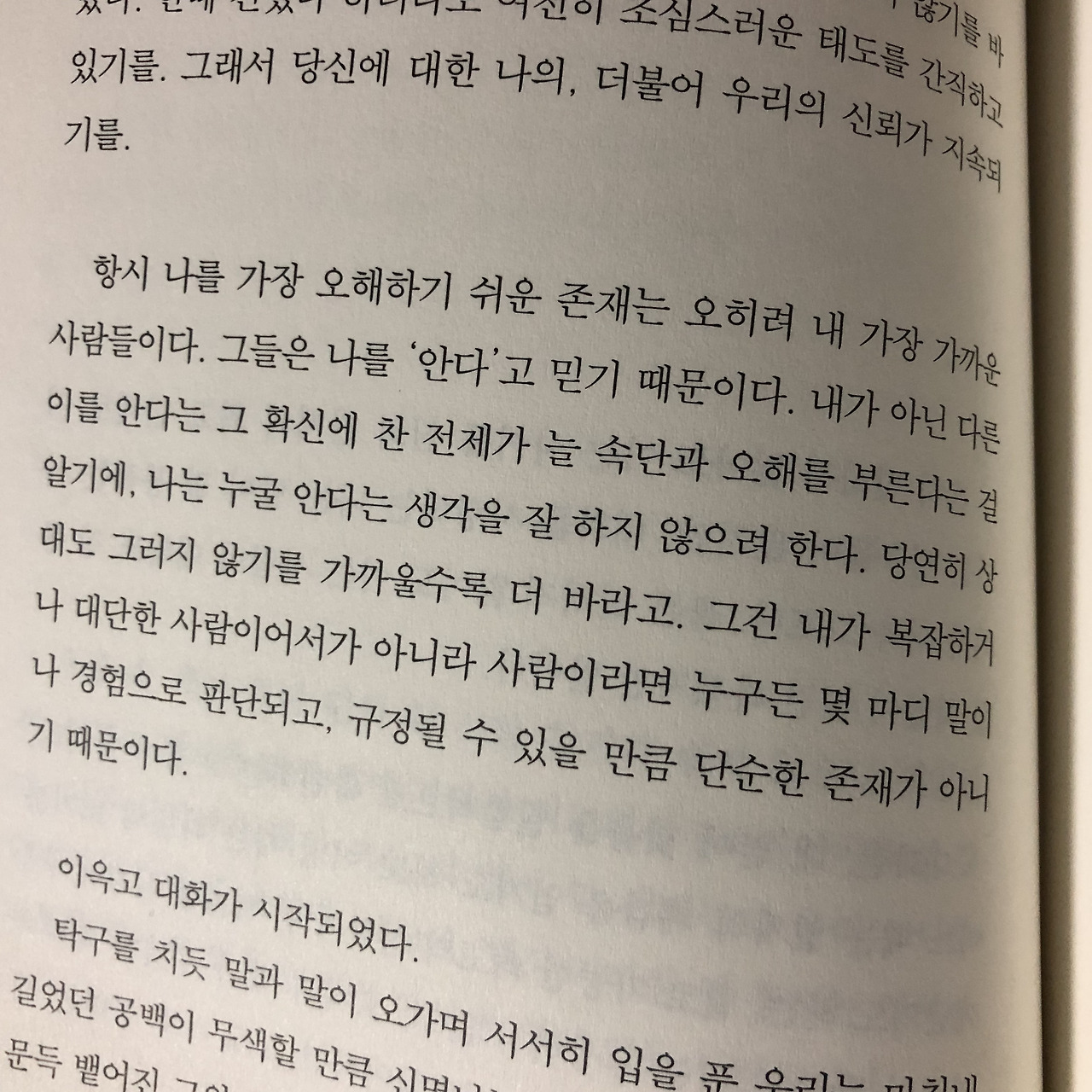 항시 나를 가장 오해하기 쉬운 존재는 오히려 내 가장 가까운 사람들이다. 그들은 나를 '안다'고 믿기 때문이다. 내가 아닌 다른 이를 안다는 그 확신에 찬 전제가 늘 속단과 오해를 부른다는 걸 알기에, 나는 누굴 안다는 생각을 잘 하지 않으려 한다. 당연히 상대도 그러지 않기를 가까울수록 더 바라고. 그건 내가 복잡하거나 대단한 사람이어서가 아니라 사람이라면 누구든 몇 마디 말이나 경험으로 판단되고, 규정될 수 있을 만큼 단순한 존재가 아니기 때문이다.