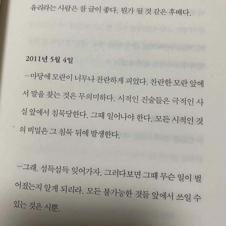시가 그녀이고, 그녀 자체가 시와 같다. 분리 시키는 것은 아마도 어려운 일 일듯싶다. 세상의 모든 것들을 온몸과 마음으로 느끼고, 생각하고, 써 내려갔다. 제목은 가기 전에 남긴 시글들이지만, 분명 살기 위해 남긴 글이 아닐까.