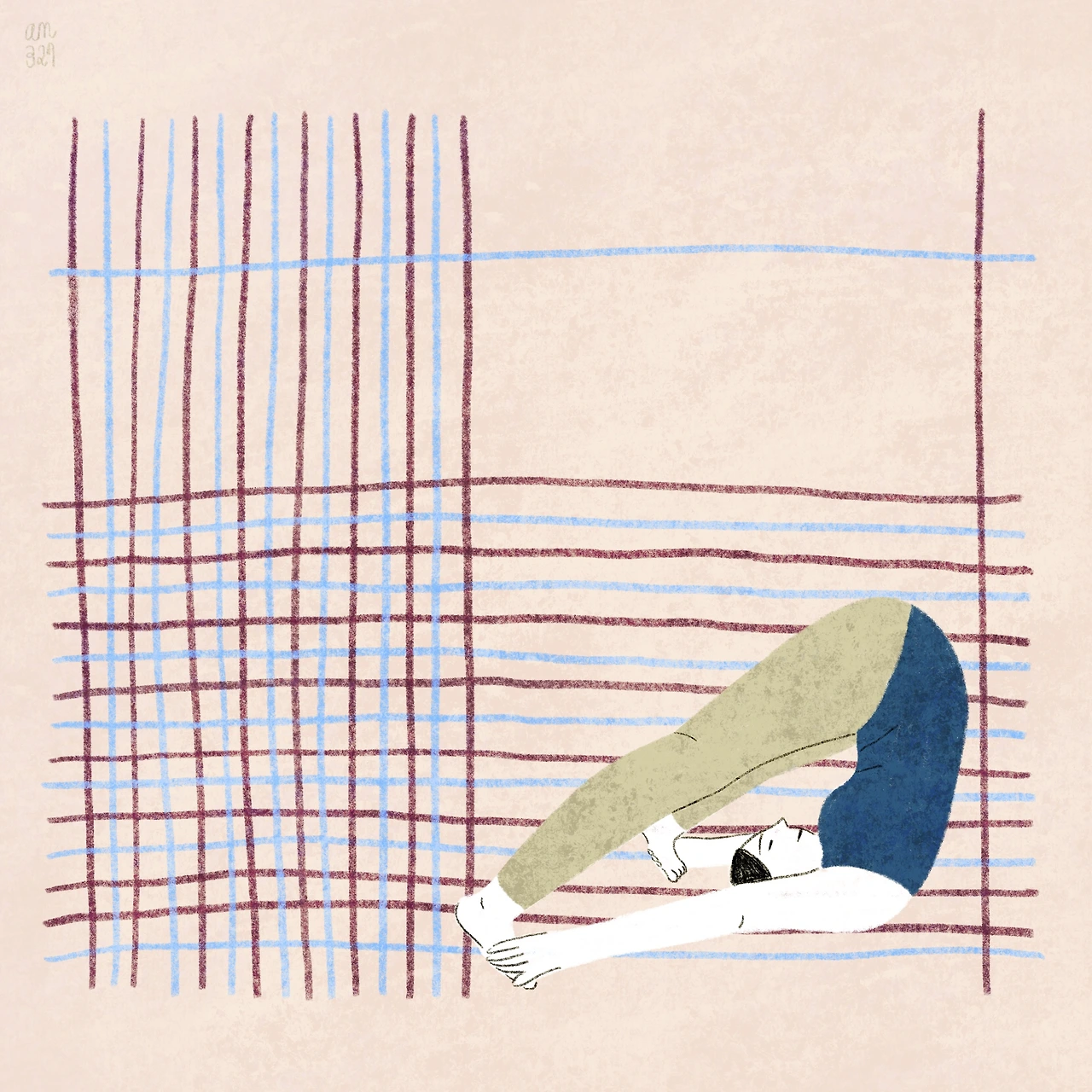 카르나피다아사나에서 숨을 살펴보다가 가장 적절하다 여기지는 호흡에 다리를 먼 곳으로 뻗어본다. 자연스럽게 숩타 코나아사나로 연결된다. 코로 들어온 숨은 세로로 몸을 세우고, 가로로 몸을 펼칠수 있게 도와주는데 그러는 동안 시간에 부드러운 무늬가 새겨진다. 이렇게 동작안에서 머무르는 모습을 누군가 슬쩍 바라본다면 아마 멈춰있다고 생각할지도 모른다. 고요하게 머무르는 동안 내면에서 일어나는 세로의 시간과 가로의 시간의 반복을 눈치챌 수 있는 것은 숨을 관찰하고 있는 나, 나를 그만큼 더 잘 알게 되어 아름답고 선선한 무늬를 새기고 있는 나이다.