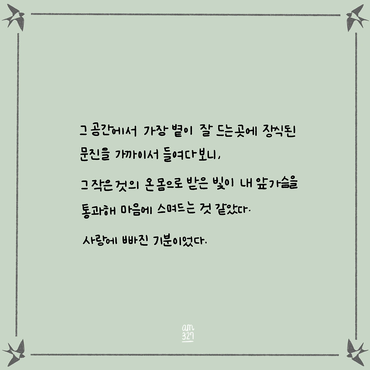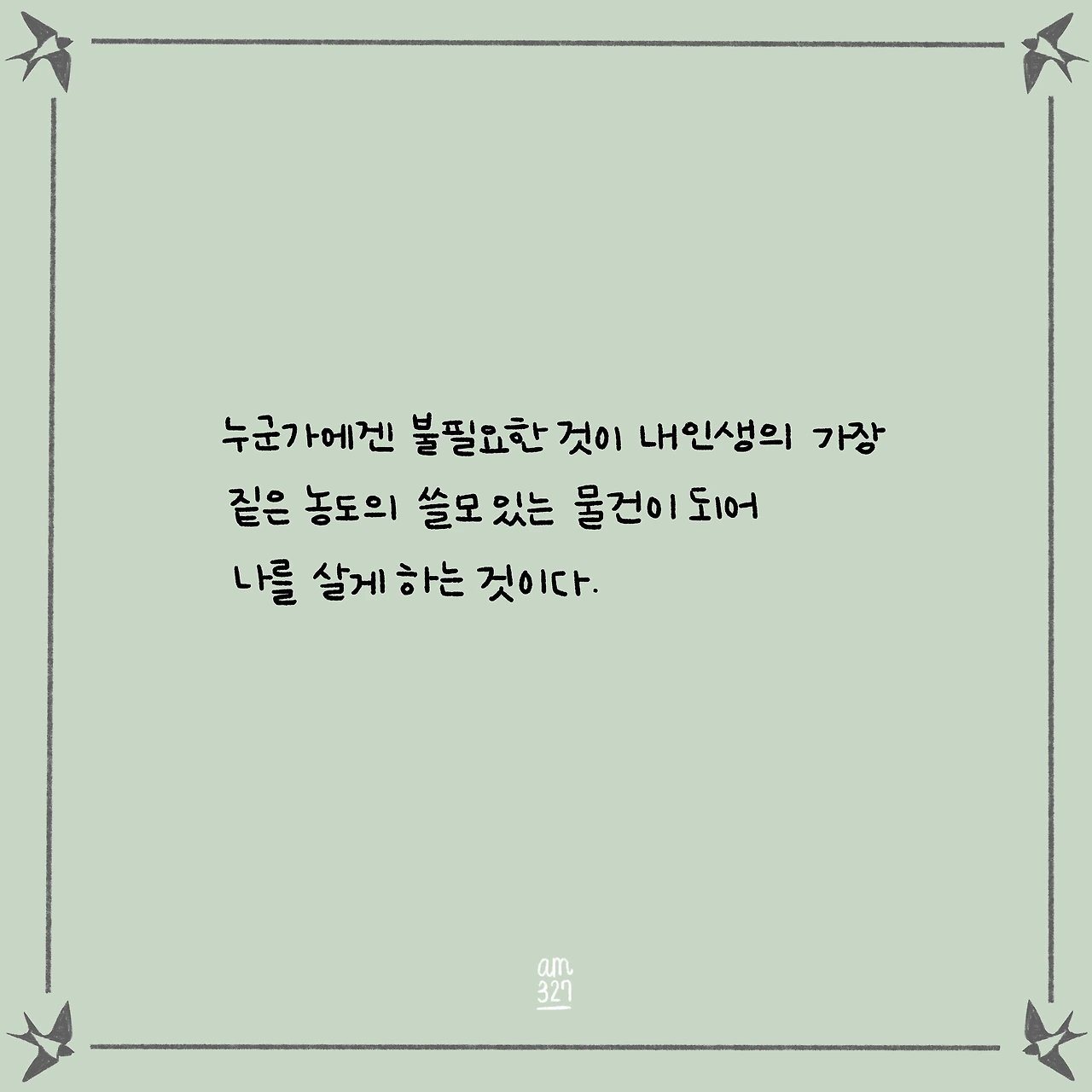 마음이 고단하고 나를 지키는 일이 힘든 밤이면 내 강아지의 체온과 엄마가 보내준 참기름 냄새와 책상 위에 놓인 민들레 문진이 나를 지탱한다. 누군가에게는 불필요한 것이 내 인생에서 가장 짙은 농도의 쓸모 있는 물건이 되어 나를 살게 하는 것이다.