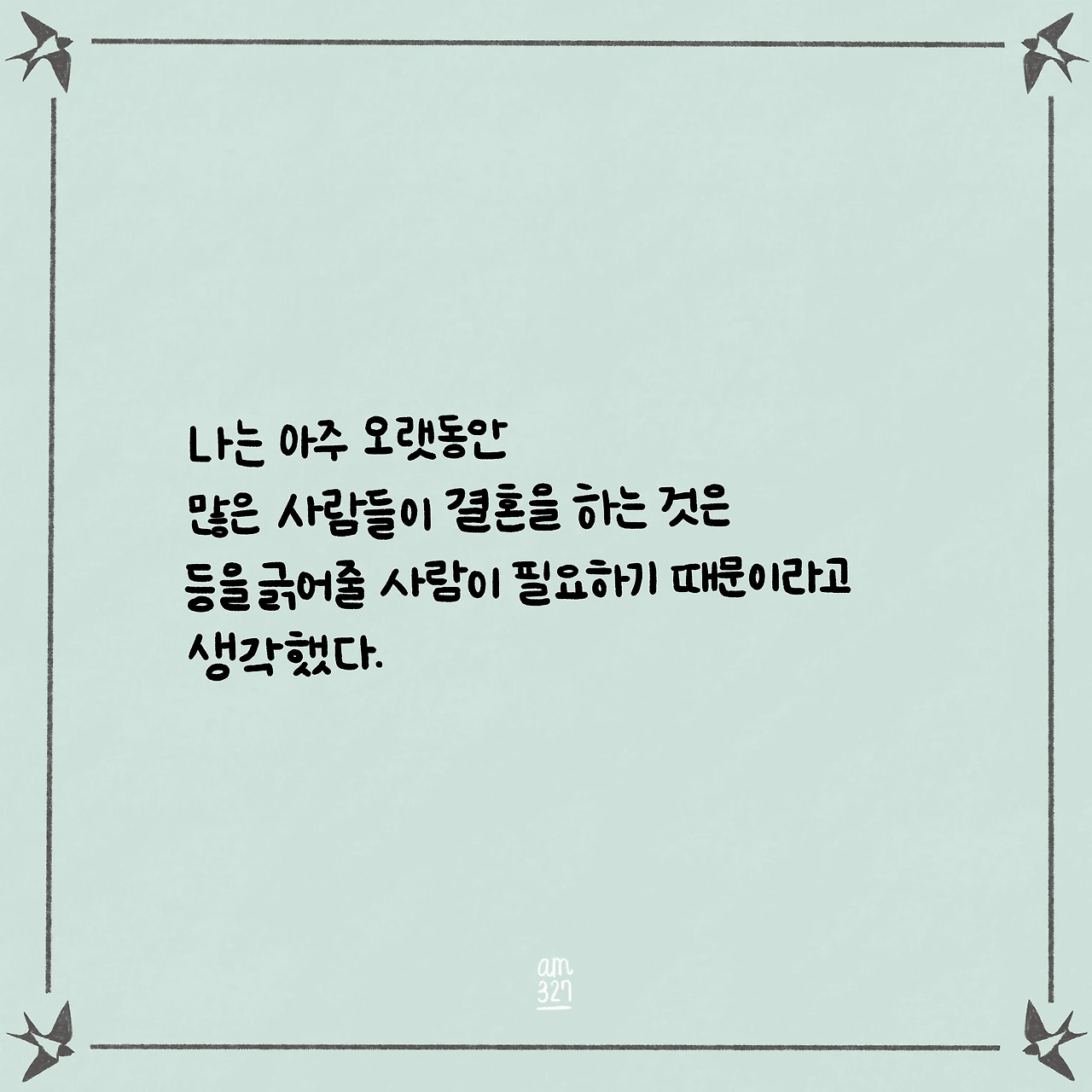 기혼자에게서 나오는 달콤한 결혼 후일담이 가뭄이던 시기에 들은 친구의 말은, 효자손 같기만 하던 딱딱한 결혼에 대한 생각을 말랑하게 풀어 다시 정의 내리는 계기가 되어주었다.