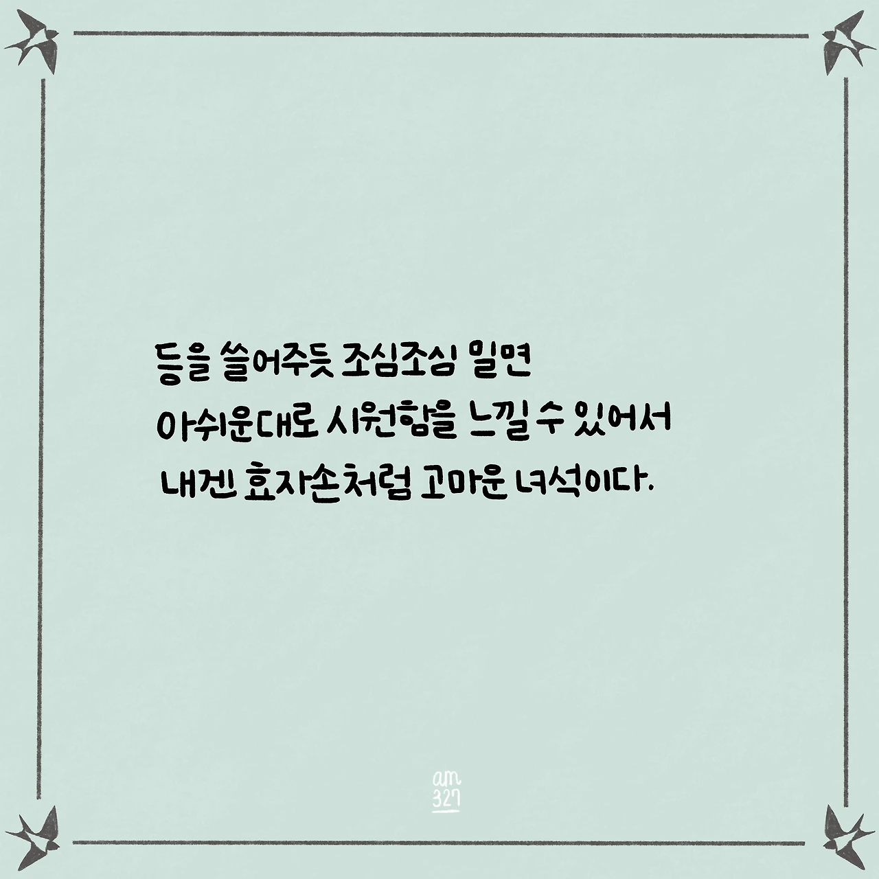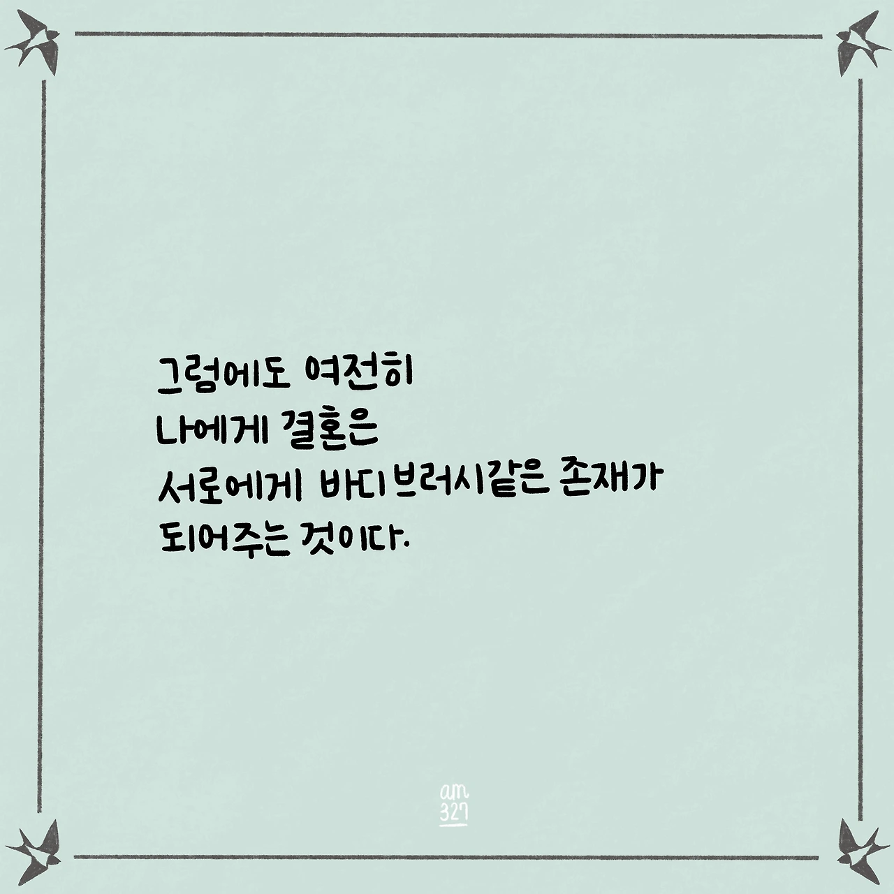 하지만 그럼에도 여전히 나에게 결혼은 서로에게 바디 브러시 같은 존재가 되어주는 것이다. 하지만 이제는 그 범위가 넓어졌다. 결혼이란 등의 가려움을 넘어서서, 마음의 가려움을 긁어줄 노력을 함께 하는 것. 밖에서 쌓아온 먼지, 가려웠던 마음을 집에서 서로 툭툭 털어주고 삭삭 긁어 입꼬리를 올려주는 것. 쓰고 보니 말이 쉬워서 마음의 각오는 더욱 단단히 하게 되는 그런 것.