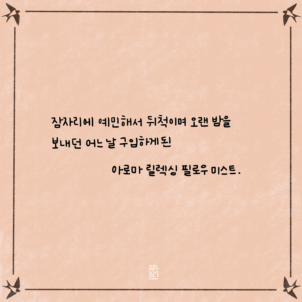 중요한 것은 필로우 미스트를 사용하고 난 뒤부터 예전보단 훨씬 숙면을 하고 평소에도 전체적으로 좀 더 차분해진 게 느껴진다는 사실이다. 하던 일을 멈추고 필로우 미스트를 옷에 뿌리면 자연스레 눈을 감고 이 향을 탐하기 위해 깊은숨을 들이마시고, 내쉬게 된다. 이 스프레이가 나에게는 하루 중 잠시나마 몸과 마음에 여백을 만들어주는 것만으로 제 값을 다 하는 고마운 제품이다.