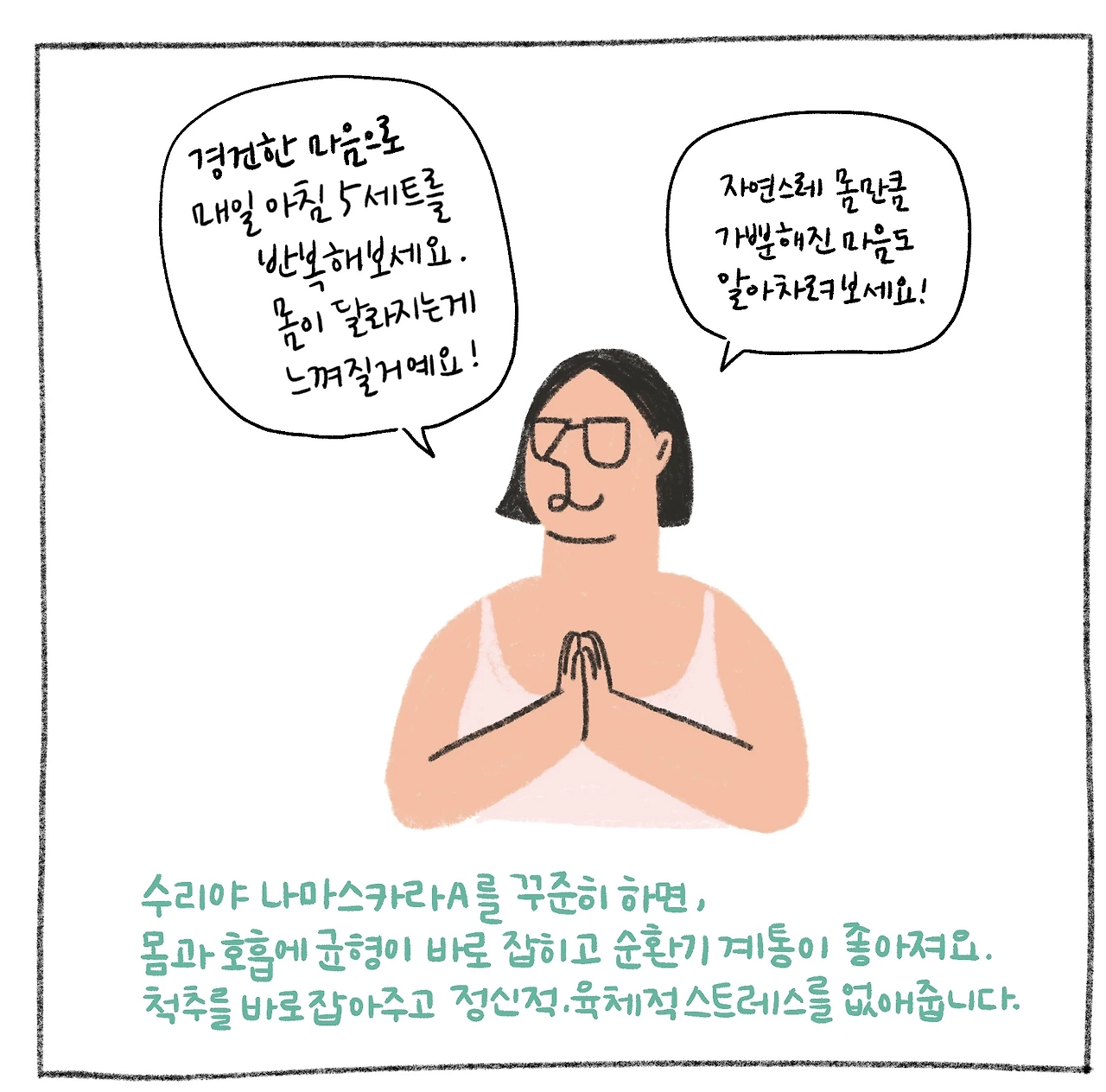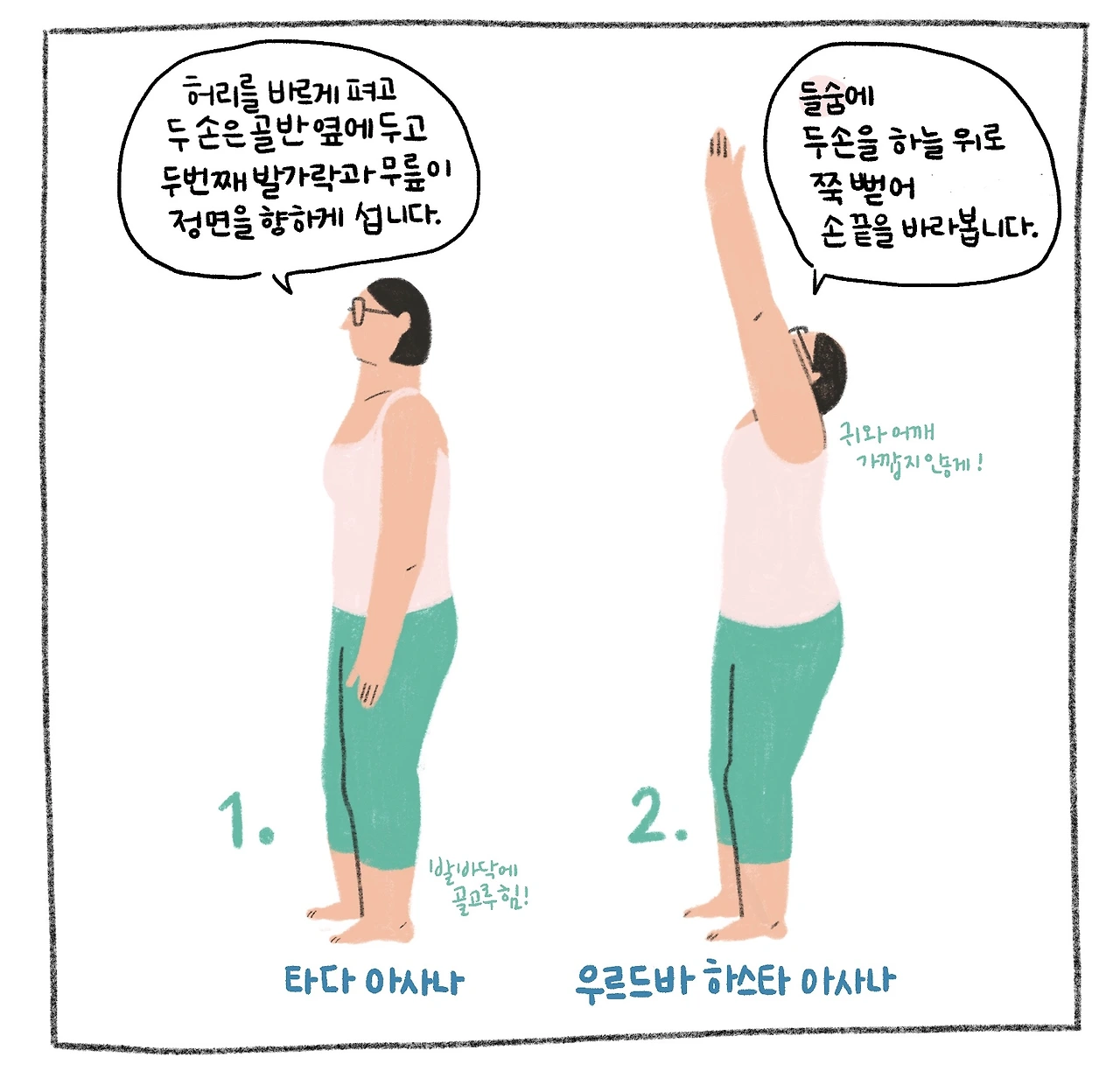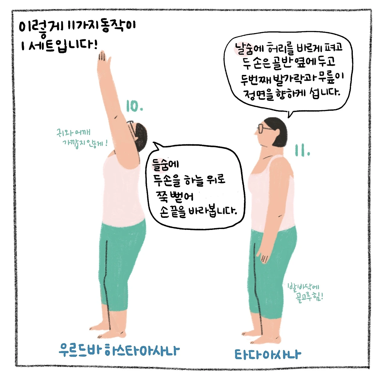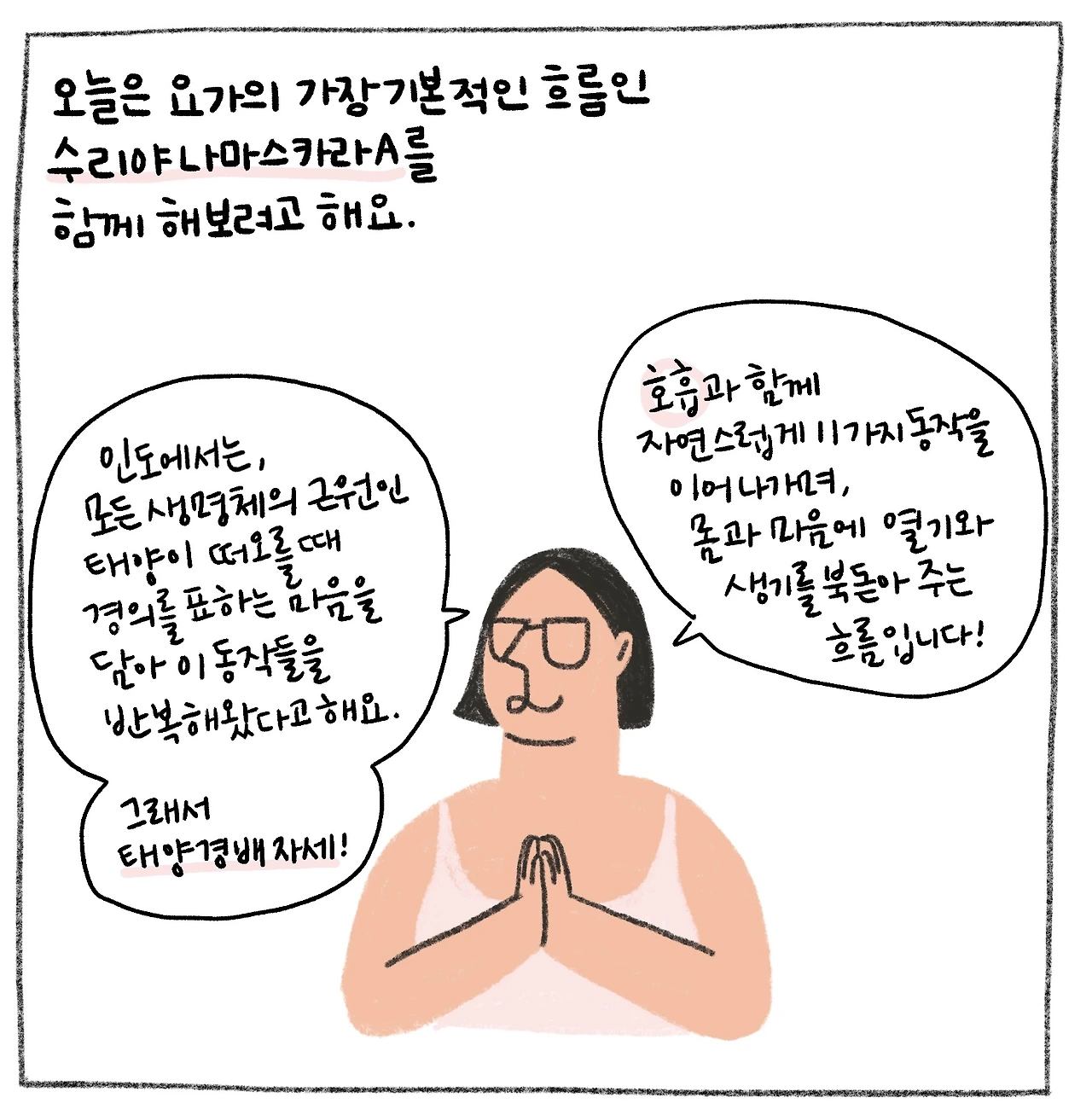 선 자세 위주로 구성되어 큰 근육을 사용해 몸에 열을 일으키는 태양 경배 자세입니다. 이열치열!