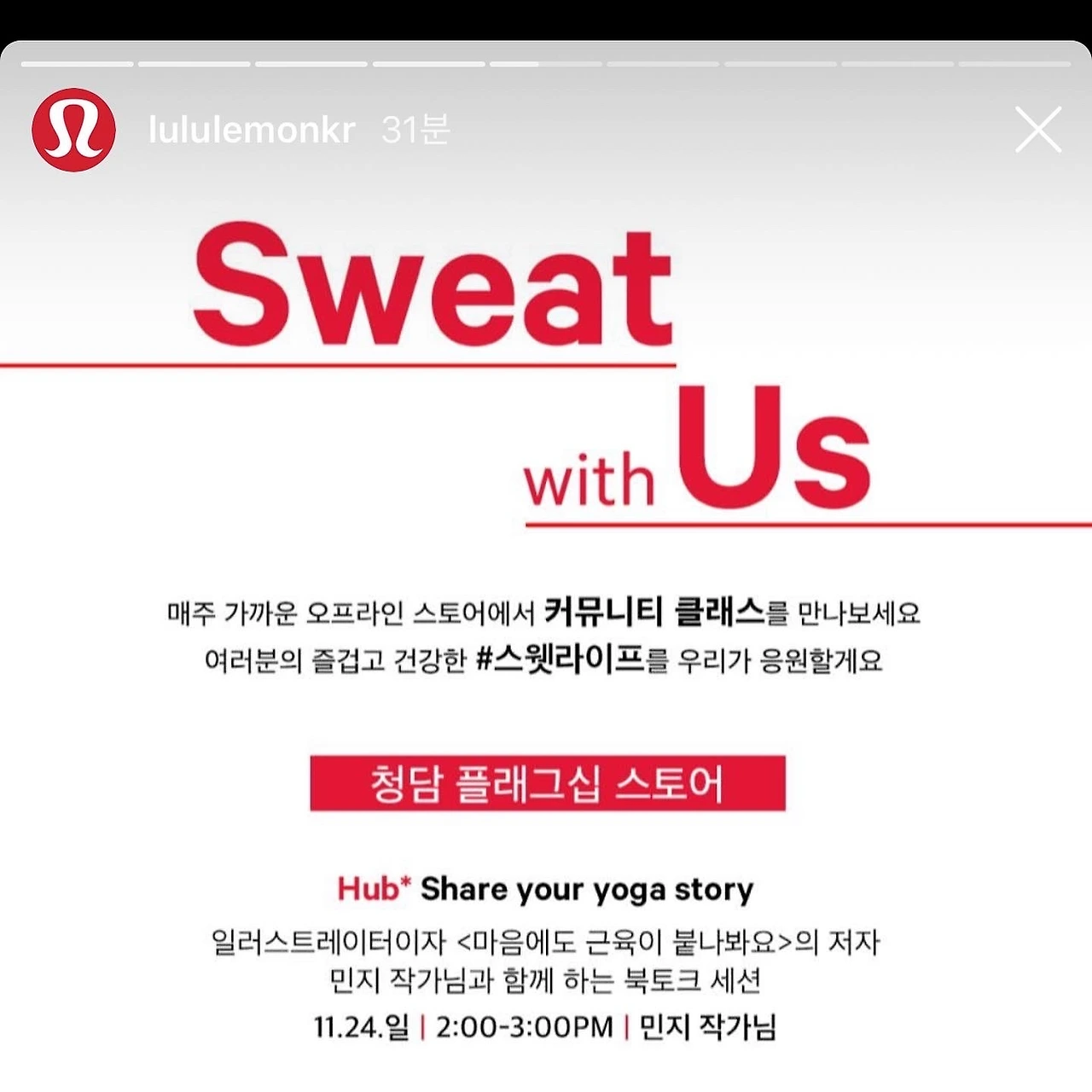 이번 주 주말에 룰루레몬(@lululemonkr) 청담 플래그십 스토어에서 <마음에도 근육이 붙나 봐요> 북토크가 있어요! 쑥쓰럽지만 함께 이야기 나눌 기회가 생겨서 무척 좋습니다 :)