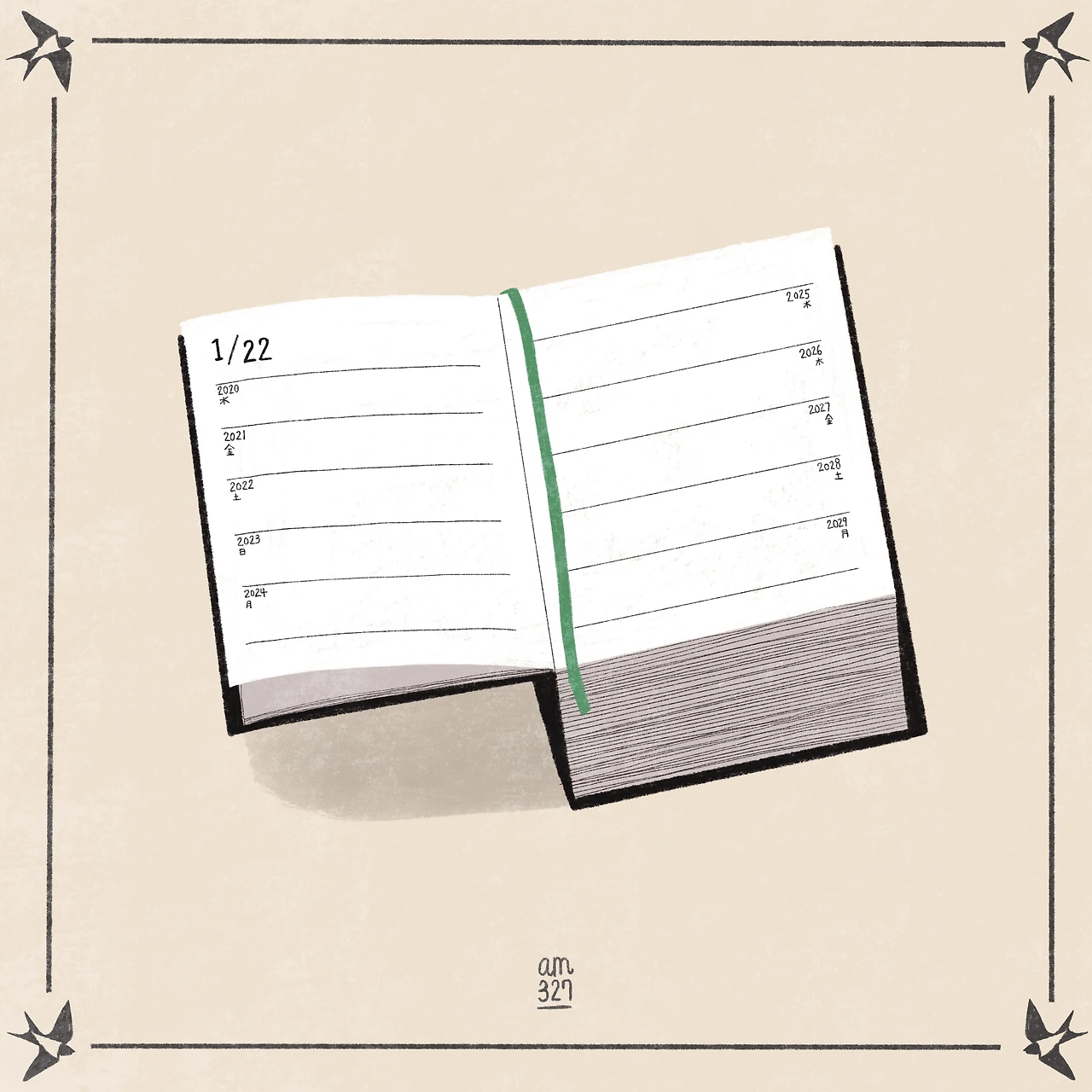 두꺼운 벽돌 같은 생김새의 다이어리를 처음 알게 된 것은 재작년 연말이었다. 인스타그램을 둘러보다가 알게 된 작은 서점에서 제작해 판매 중인 제품이었다. 두 페이지에 걸쳐 10년 치의 오늘이 펼쳐져 있는 다이어리였다. 기발하다는 생각과 함께 채워져 가는 매년의 하루하루를 돌아보는 것을 상상하니 뒷 목이 간지러웠다. 그 느낌이 나쁘지 않아 바로 구입을 하려고 찾아보니 그 서점에서는 품절이 된 상태였다. 포털 사이트에 검색을 해보니 다른 제품이 몇 가지 나오긴 하는데 영 내키지 않았다. 1년을 기다려야겠다고 생각하고는 마음 한편에 담아둔 채 잊고 지냈다. 어김없이 연말이 돌아왔고 서점의 인스타그램에서 다이어리 판매 피드를 발견하자마자 주문을 넣었다. 그렇게 까만 양장 다이어리가 나에게 왔다.