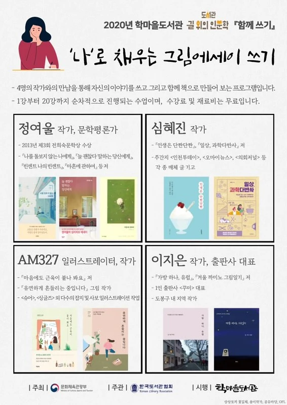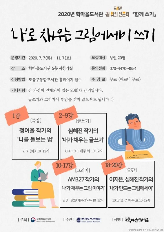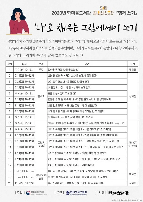 알찬 수업을 통해 올여름을 시작으로 늦가을에 이르기까지 나의 일상을 특별한 시선으로 바라보는 시간을 가져보는 것 어떨까요? 지금의 나와 그때의 나는 또 분명 다를 거예요. 더욱 자세한 이야기는 위 이미지 세 장을 참고해 주세요.