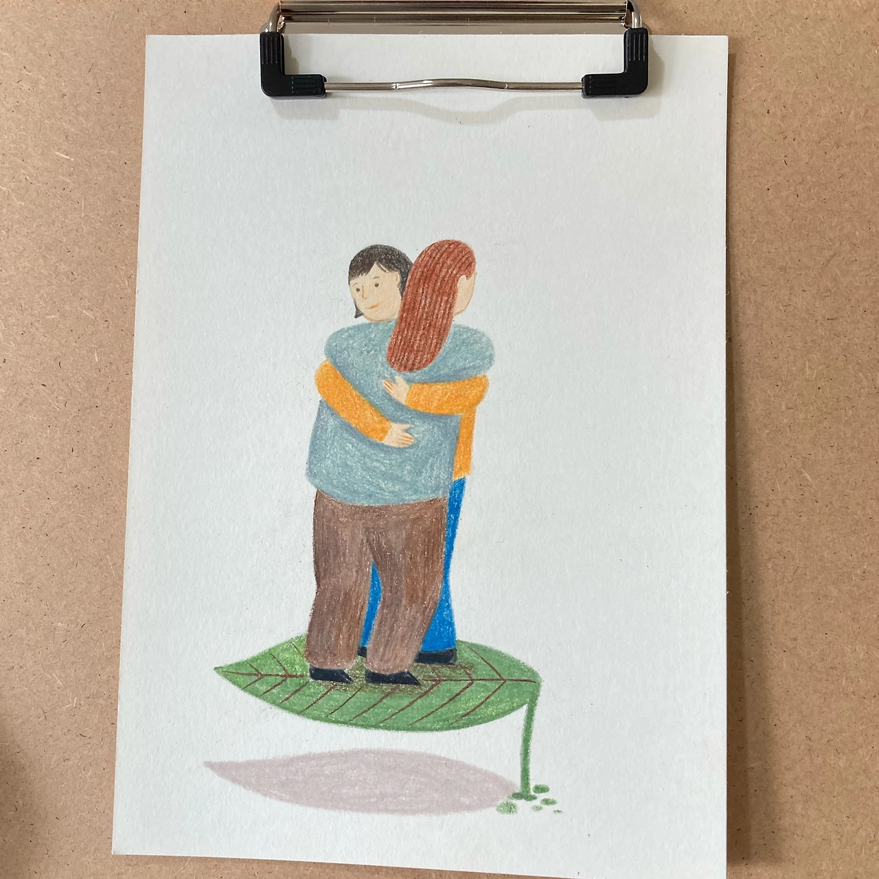 주말 오전 소규모 색연필 수업의 주제는 포옹이었어요. 우리를 포근하게 가려주던 다정한 나뭇잎과 같았던 공기, 관계가 지금은 조심해야 할 존재가 된 지금을 함께 그려보았어요. 나무 잎사귀 위에 올라가 있는 것처럼 아슬아슬한 현재를 살아가고 있지만 마음으로 서로의 등을 어루만지고 싶은 바람을 담았습니다.