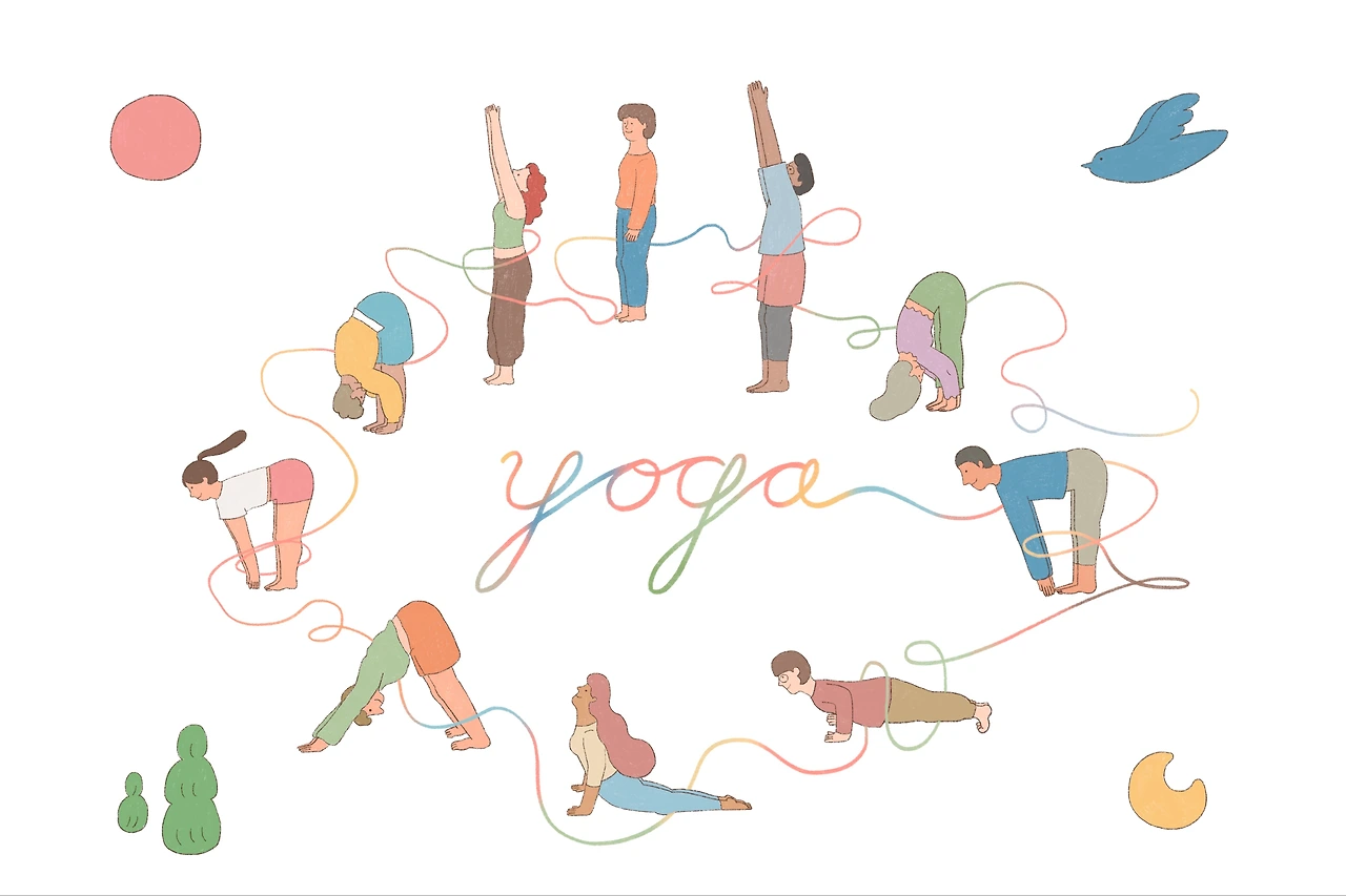 요가(yoga)는 산스크리트 ‘유즈(yuj)’가 그 어근으로 유즈는 ‘결합하다’ ‘붙이다’라는 뜻을 가지고 있어요. 요가는 ‘몸과 마음을 연결’ 하고 ‘나와 나보다 더 큰 존재와 연결’하는 것을 뜻해요. 요가를 하면서 우리 모두가 하나로 연결되어 있음을 느낍니다. 열린 마음을 가지고 오늘도 나마스떼! #yoga #yogaillustration #suryanamaskara #요가 #오늘도나마스떼