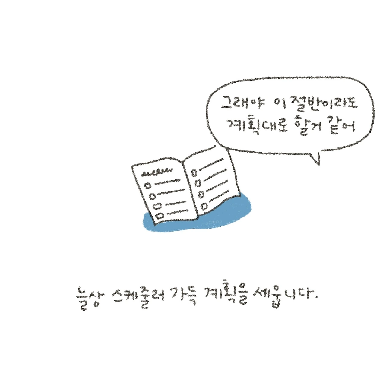 프리랜서로 일하면서부터 계획이 지켜지는지에 대한 여부보다 계획 세우면서 드는 안정감에 집착하게 된 것 같아요. 계획을 세우고 싶어지면 꼭 지켜야겠다는 다짐보다 ‘나 지금 좀 마음이 불안해서 뭔가 명확하고 싶구나’하고 바라봐 주려고요. 돈 드는 것도 아닌데 마음껏 세워야겠어요 ;)