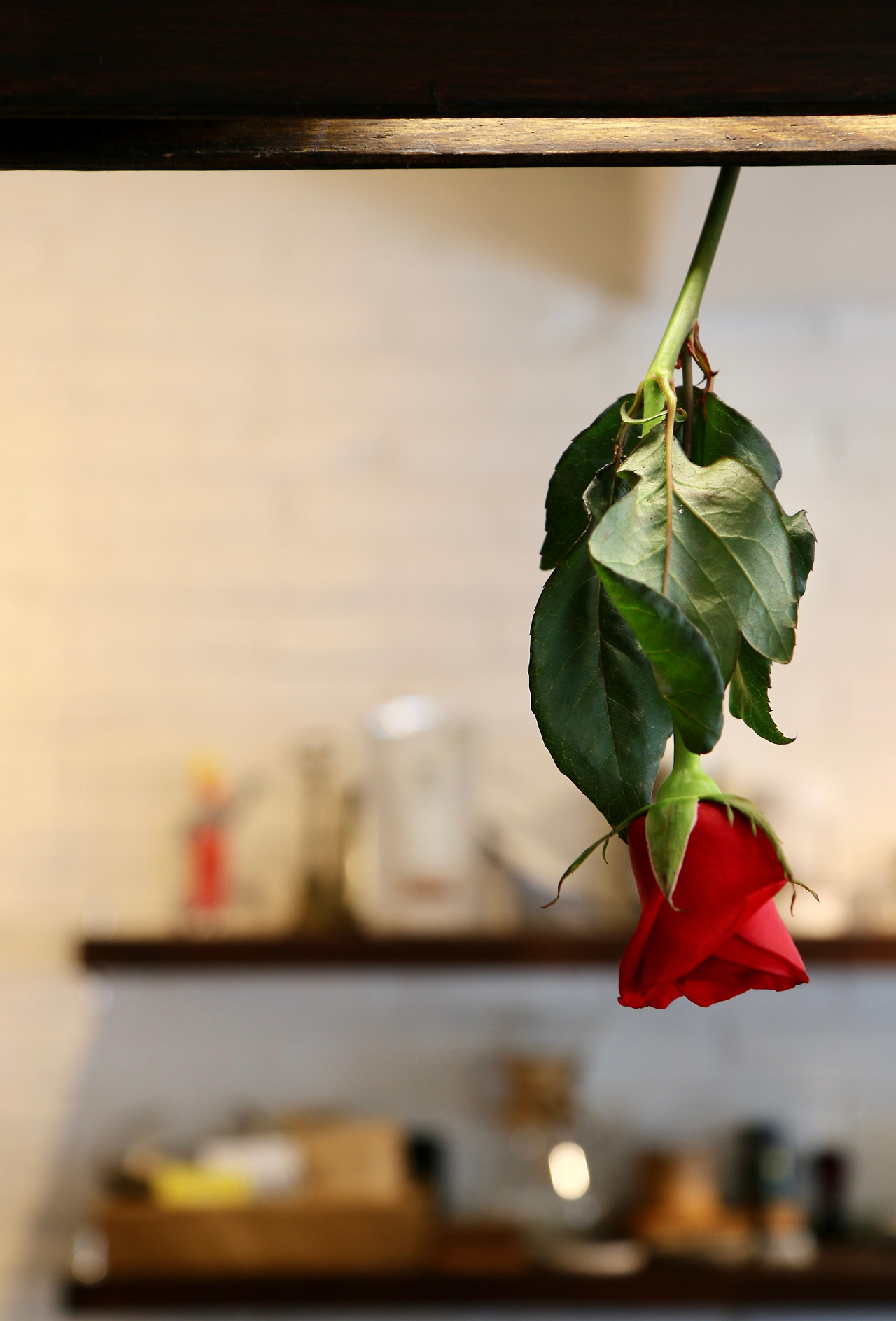 주인장은 그 장미를 카운터 조명에 달아 놓습니다.
