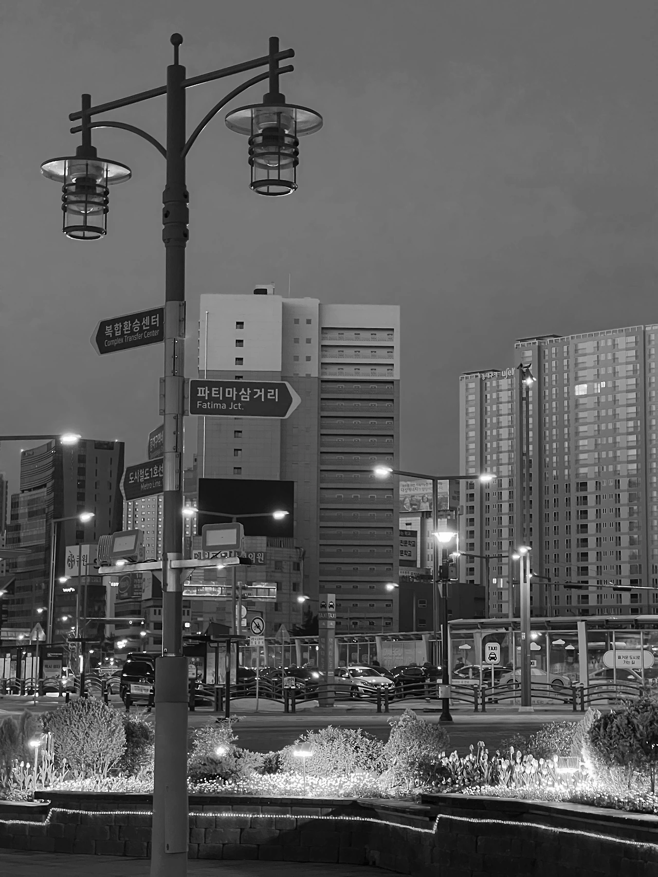 자신의 키보다 더 뻗어 있는 그림자를 광장에 드리운 가로등.
