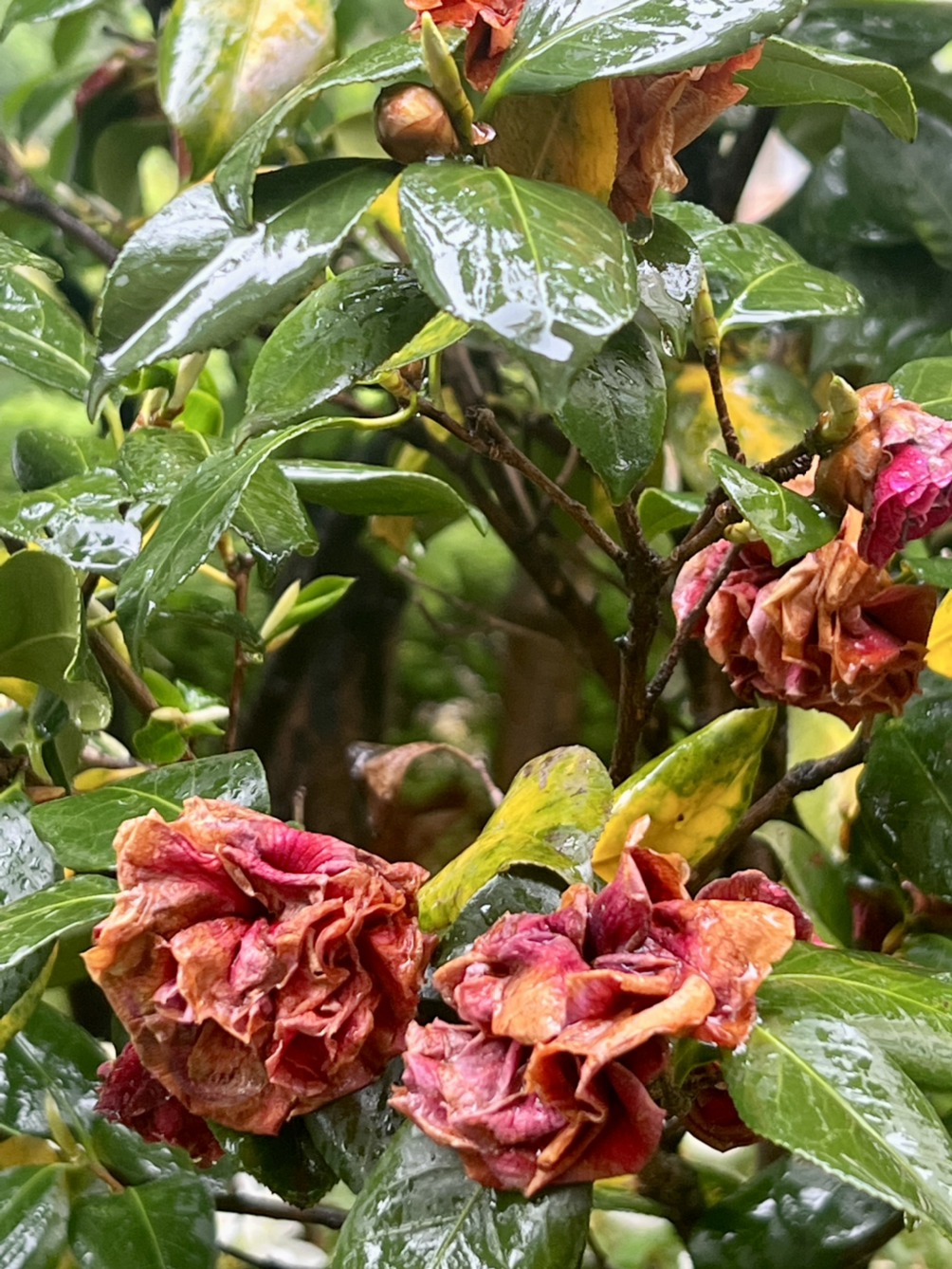 시든 동백꽃은 고개를 떨군 채 빗물로 초라함을 씻어냅니다.