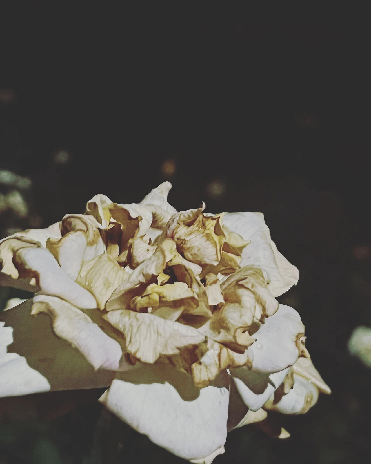장미는 퇴락한 아름다움을 보여주며 이 밤을 지새웁니다.