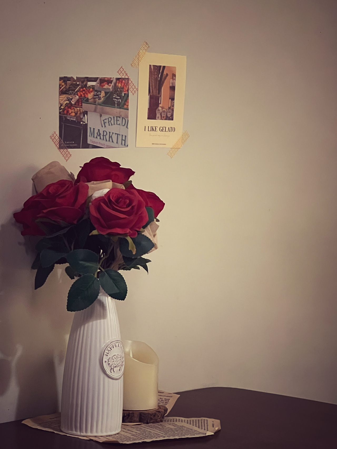 테이블 위에 덩그러니 놓인 화병의 장미는 조화일까요?