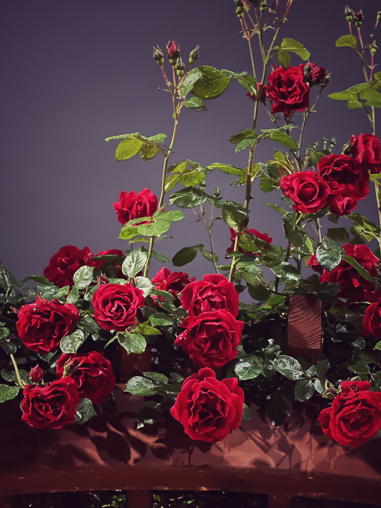 봄밤의 향기 어린 산책을 즐기다가 하늘에 핀 장미 앞에서 걸음을 멈춥니다.