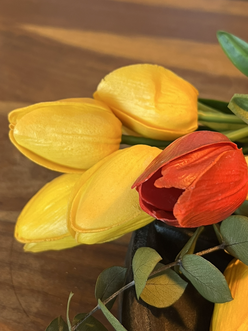 노랗고 빨간 튤립이 갈색 테이블을 배경으로 놓여 있습니다.
