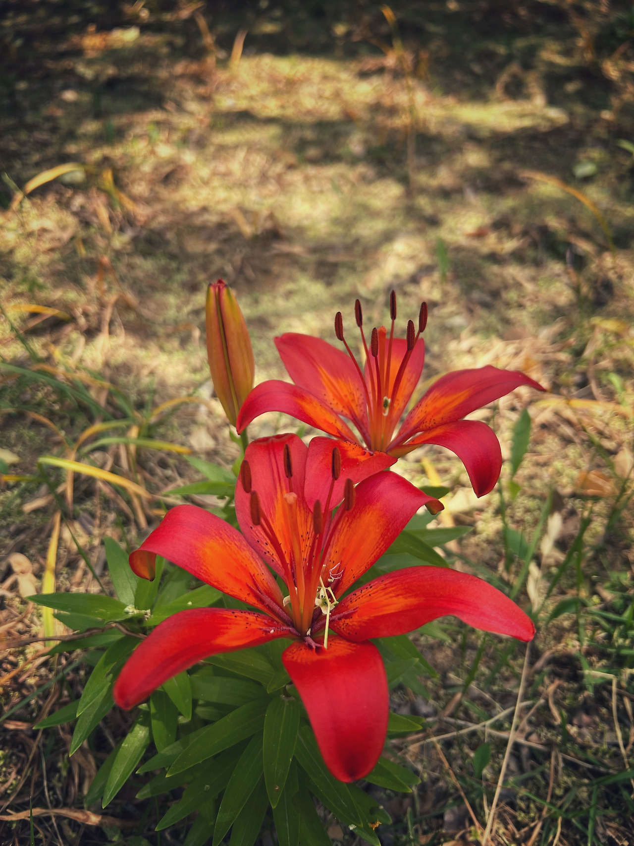 그늘과 햇살이 어우러진 절묘한 틈에서 꽃무릇은 고개를 들고 있습니다.