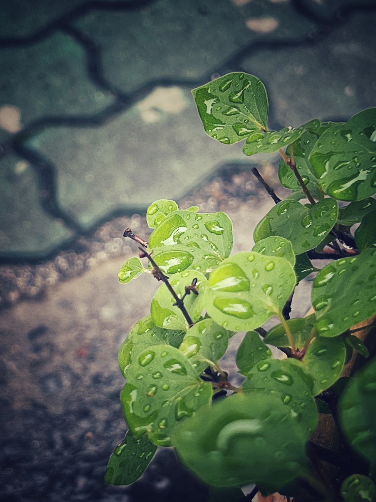 골목길 화단에 있는 이름모를 식물의 잎에 맺힌 빗방울이 외로움을 더합니다.
