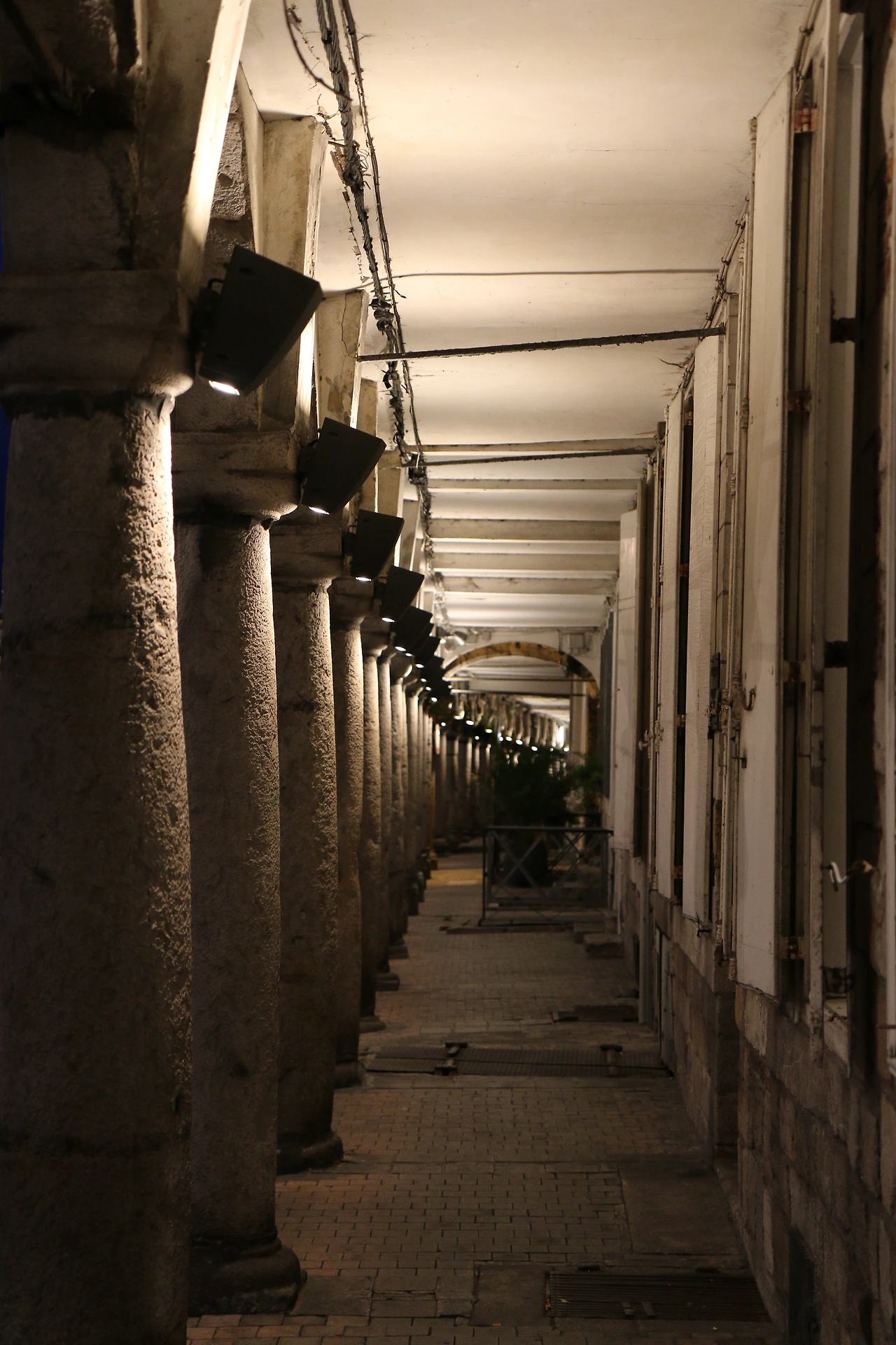한때는 사람들로, 노점들로, 뛰노는 아이들로 가득했을 아케이드는 고요합니다.