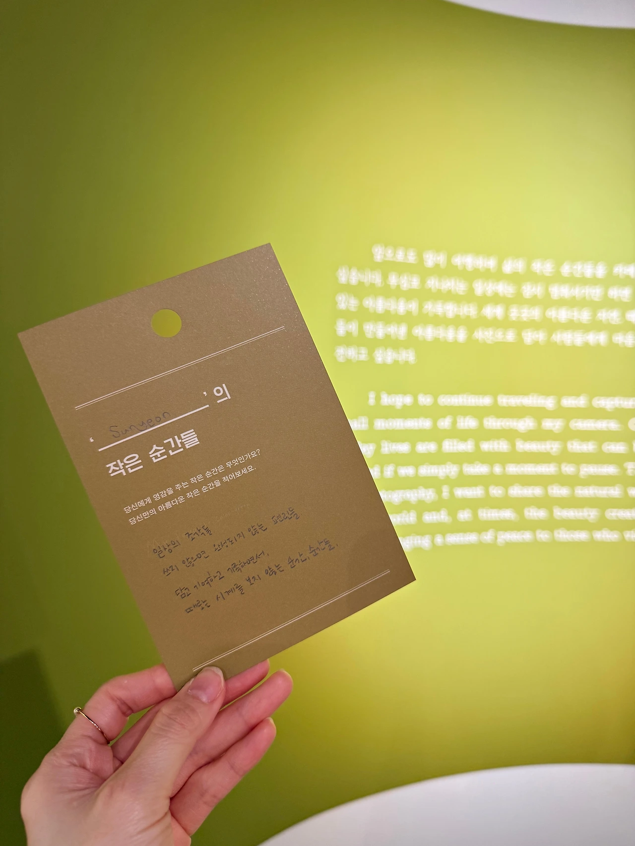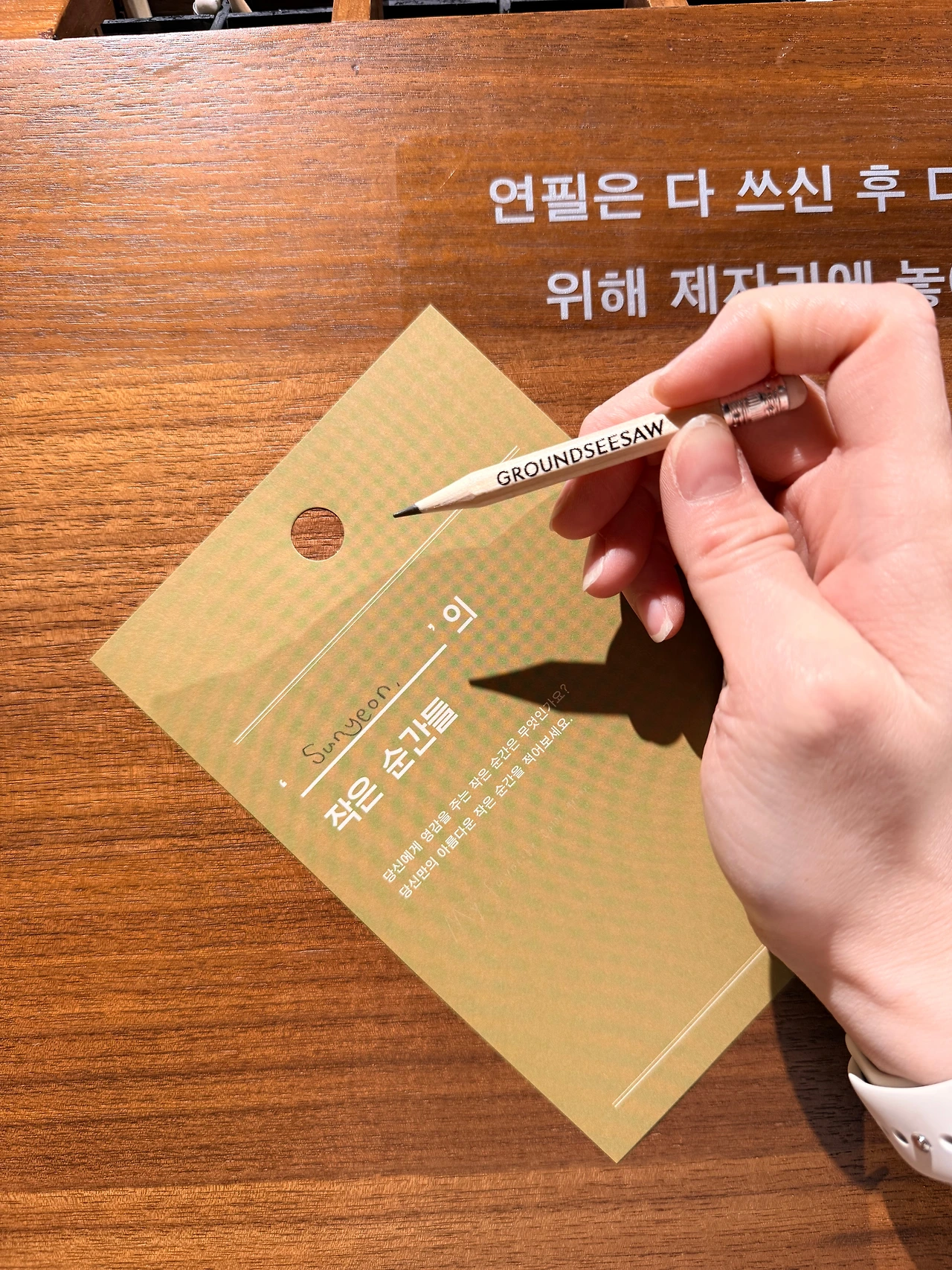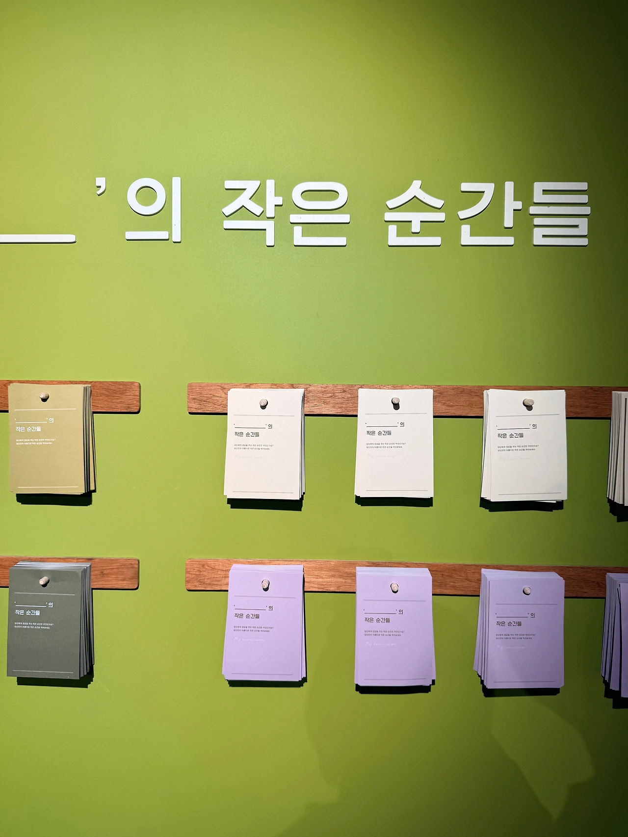 전시의 마지막에는, 관람자가 스스로의 작은 순간을 적어볼 수 있는 체험 섹션이 준비되어 있었다. 같이 준비되어 있는 몽당연필이 귀여웠다. 이때 적은 작은 순간들은 지금, 내 오른쪽 벽에 단정하게 붙어 있다.