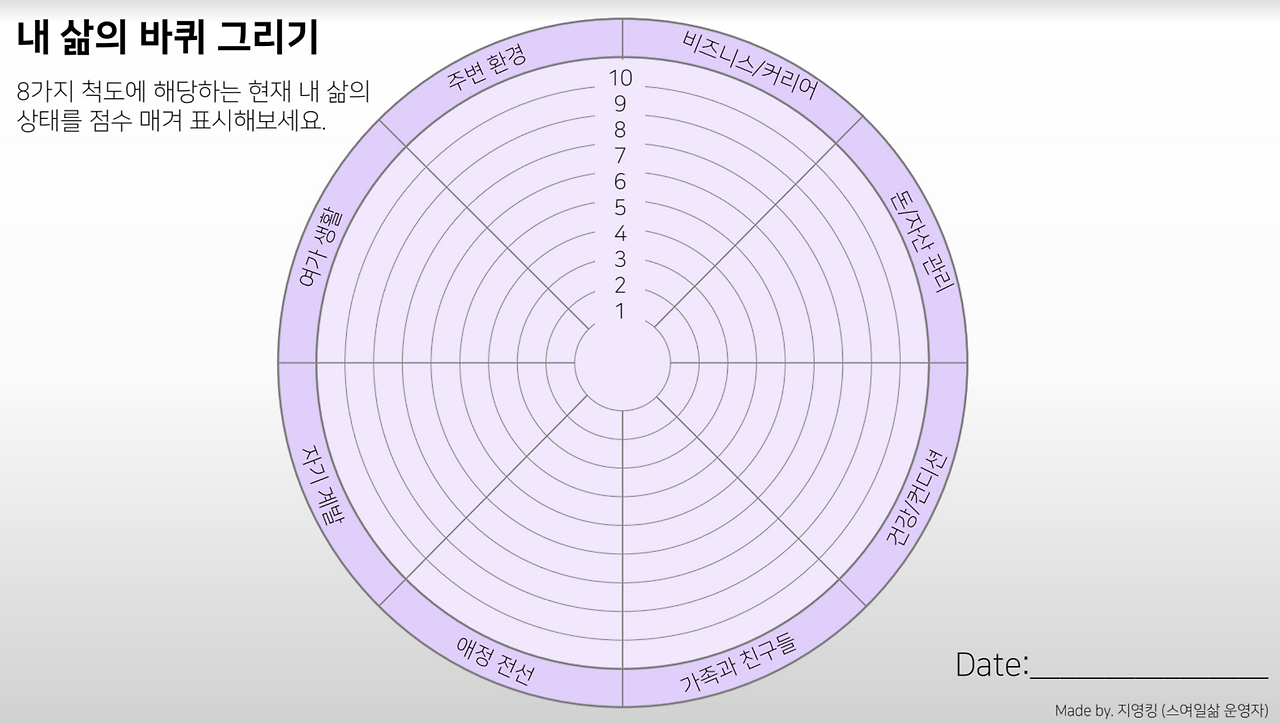 여덟 가지 질문을 스스로에게 던지며 1-10점 척도로 자신의 삶을 평가해보는 워크시트다. 이 바퀴는 찌그러진 부분 없이 동그랗게 그려질수록, 그리고 10점 만점에 가까운 큰 동그라미일수록 좋다고 한다.
