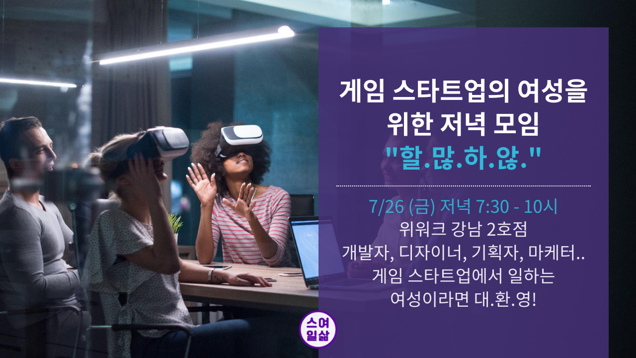 개발자, 디자이너, 기획자, 마케터.. 다 좋습니다. 게임 스타트업에서 일하는 여성이라면 대환영! 회사에서는 소수여서 못 했던 이야기들, 할 말 정말 많지만 지금까지 어디서도 못 했던 속 얘기들! 다른 게임 스타트업 여성들과 함께 나눠보아요!