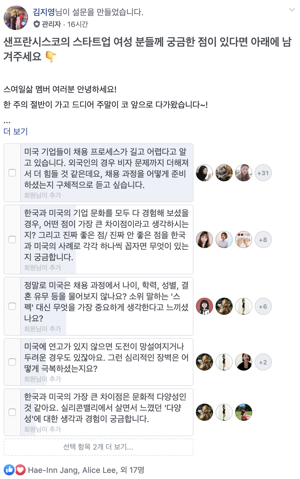 혹시 평소에 샌프란시스코의 스타트업, 기업 문화에 대해 관심이 있고 궁금한 점이 많았다면 그룹에 있는 설문 조사 글에 질문거리를 남겨주세요. 지영킹이 대신 물어보겠습니다! �