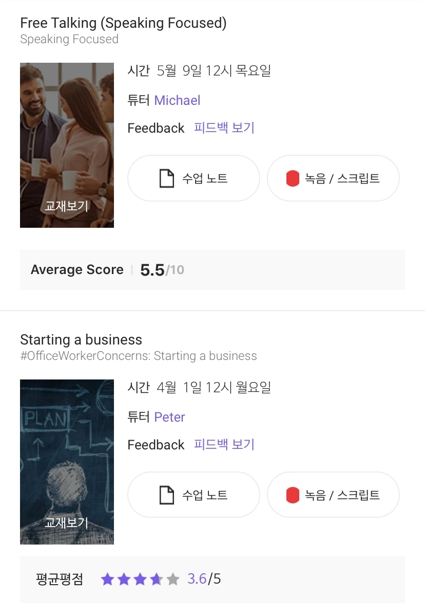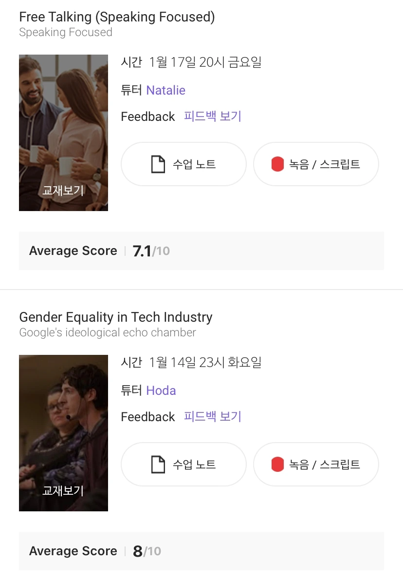 그런 데 며칠 전 재밌는 걸 발견했어요. 링글에서는 수업이 끝나면 튜터가 학생의 말하기 실력을 부분 별로 점수 매겨서 피드백을 남겨주시거든요. 얼마나 유창하게 말을 했는지, 적절한 단어를 썼는지, 발음은 괜찮았는지, 문법이나 문장의 정확성은 어땠는지를요.