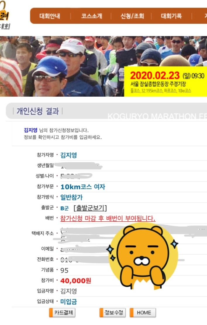 그리고 좀 더 꾸준히, 억지로라도 달려야만 하는 이유를 만들면 좋을 것이라 생각했다. 해서, 마라톤 대회에 신청했다. 2월에는 고구려 마라톤 5월에는 여성마라톤, 각각 10km 코스를 뛰어보려고 한다.