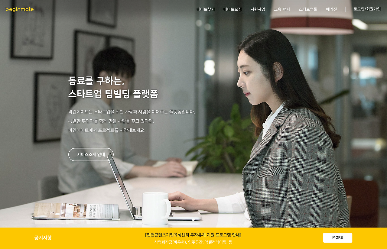 비긴메이트는 '스타트업 팀빌딩 플랫폼'으로, 초기 스타트업들이 팀원을 찾고 팀을 빌딩 하는 데 도움이 되는 정보들 위주로 구성되어 있습니다. 코파운더나 초기 창업을 같이 할 사람들을 찾는 데 특화되어 있습니다. 초기 스타트업에게 도움이 되는 정책/지원 사업의 정보도 볼 수 있습니다.