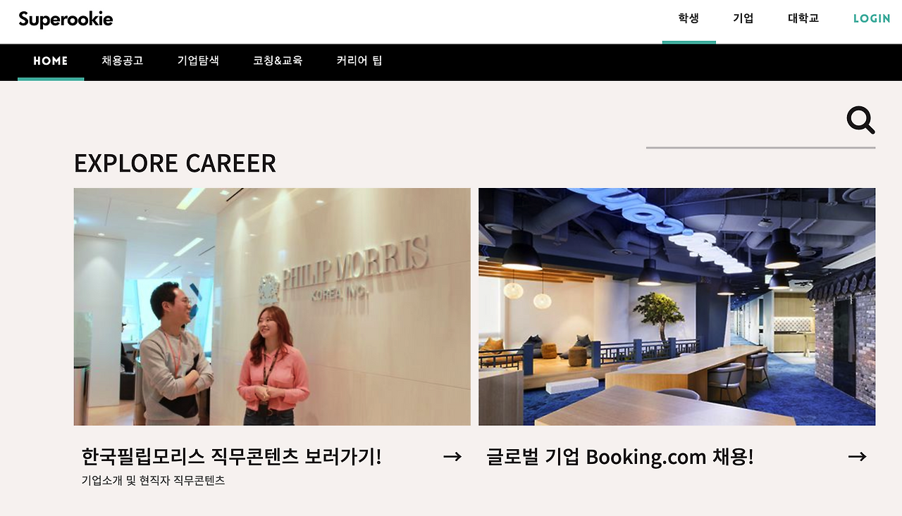 슈퍼루키는 대학생에 초점을 맞춘 커리어 사이트입니다. 대학교 - 기업 - 학생을 연결하는 콘셉트입니다. 그렇다 보니 자연스럽게 코칭과 교육 서비스가 붙을 수밖에 없었을 것으로 유추해볼 수 있습니다. 대학생 분들에게 선호도가 높은 큰 회사들의 정보가 많습니다.