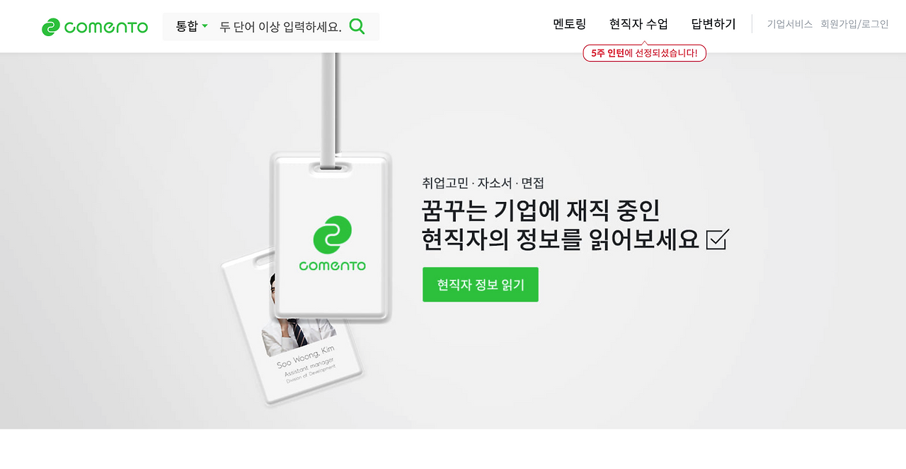 코멘토는 '취업 준비생'의 입장에 초점을 맞춘 서비스입니다. 현직자와 취준생을 매칭 시켜주고, 질문과 응답을 받을 수 있는 커리어 계의 '지식인'같은 콘셉트입니다. 최근에는 현직자 강의도 오픈했습니다.
