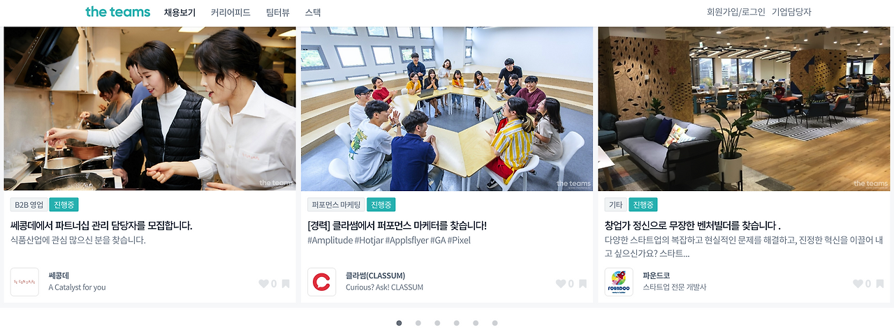 더팀스는 팀터뷰, 커리어 피드 등 채용 커리어와 관련된 '컨텐츠'를 중심으로 사이트가 구성되어 있습니다. 회사 홈페이지 외의 더 자세한 내용을 보고 싶을 경우 참고하면 좋을만한 양질의 정보가 많습니다. 스타트업 관련 정보가 많습니다.