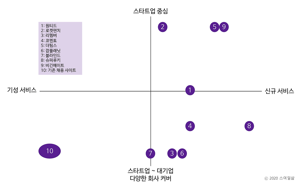 y축은 사이트 내에서 다루고 있는 채용 관련 정보가 얼마나 스타트업 중심인가에 따라 나누었습니다. 즉, 9번 비긴메이트는 스타트업이 초기 팀빌딩을 위해 팀원을 찾기 위해 특화된 서비스여서 위쪽에 위치했고, 6번 잡플래닛 같은 경우에는 크고 작은 기업, 외국계 등 여러 형태의 회사의 정보를 모두 커버하고 있기 때문에 아래쪽에 있습니다.