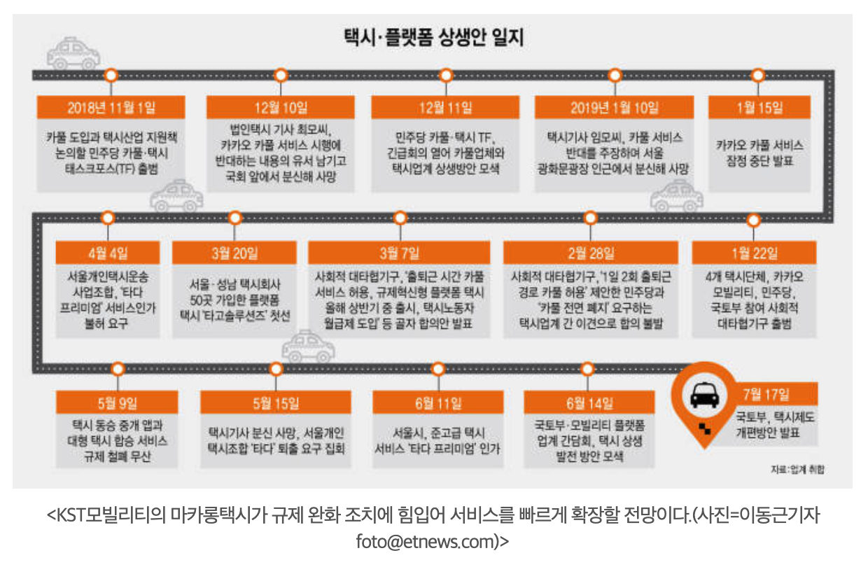 여기에 타다의 등장은 잠잠해질 뻔한 불씨에 기름을 끼얹은 격이 되었죠. ( 개인택시운송조합의 타다 반대 시위 기사 6 )