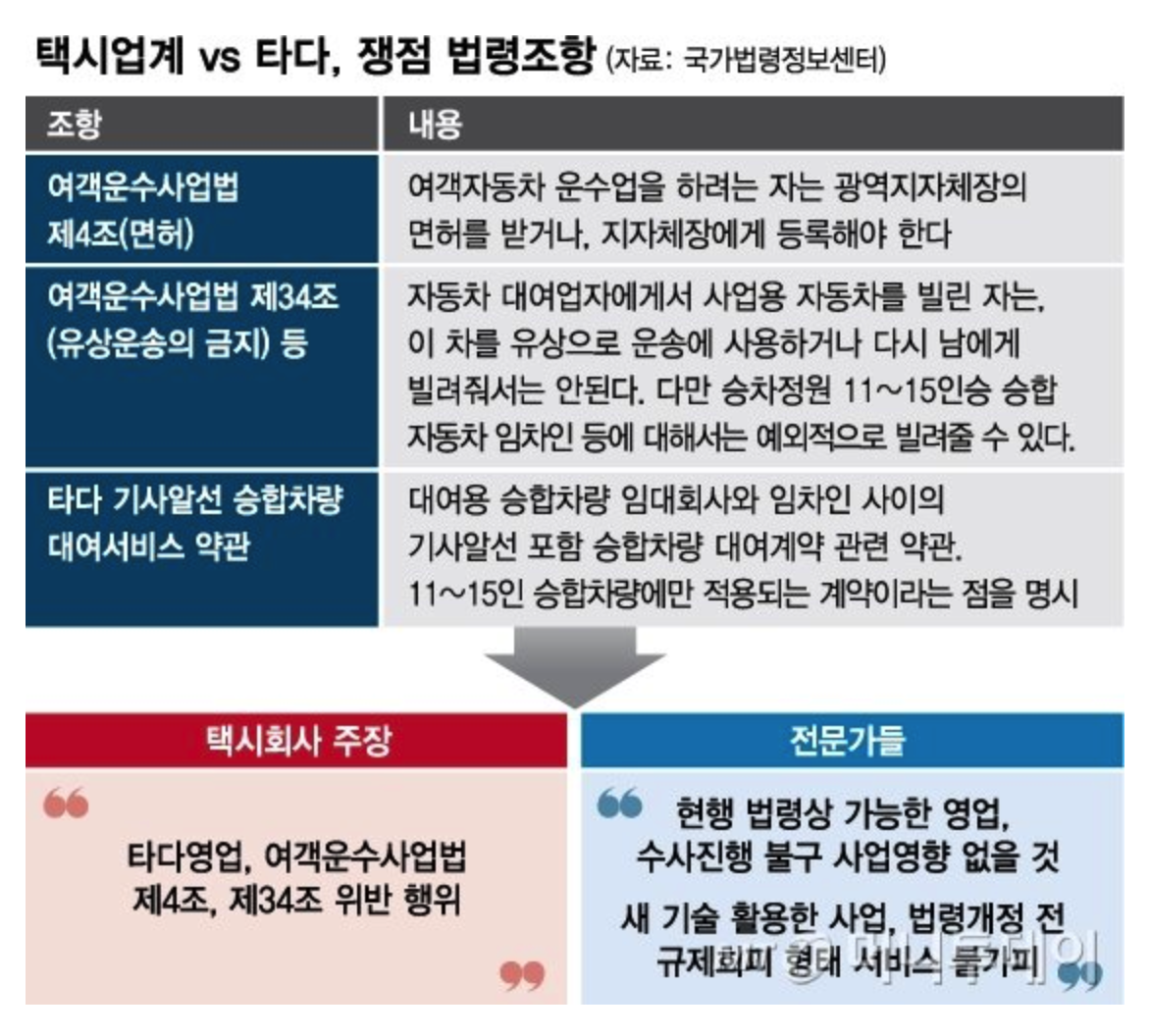 하지만 이 사회적 합의가 이루어지는 것은 매우 어렵고 지난한 과정으로, 계속해서 타다를 둘러싼 논란이 제기됩니다. 가장 첨예한 갈등을 보였던 부분이 타다가 '여객운수사업법 제4조와 34조'를 어겼느냐, 아니냐에 대한 것이었죠. ( 관련 기사 11 - 사진 출처: 머니투데이)