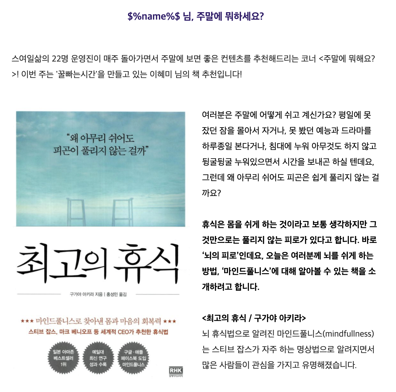 예를 들어, 스여일삶 뉴스레터 도입부만 봐도 고정되어 있는 내용들이 있다. 이 뉴스레터를 왜 보내게 되었는지, 처음 뉴스레터를 받는 사람들로 하여금 납득이 갈 수 있도록, 그리고 뉴스레터의 헤드 이미지, 첫인사, 가벼운 도입부 등이 그것이다.