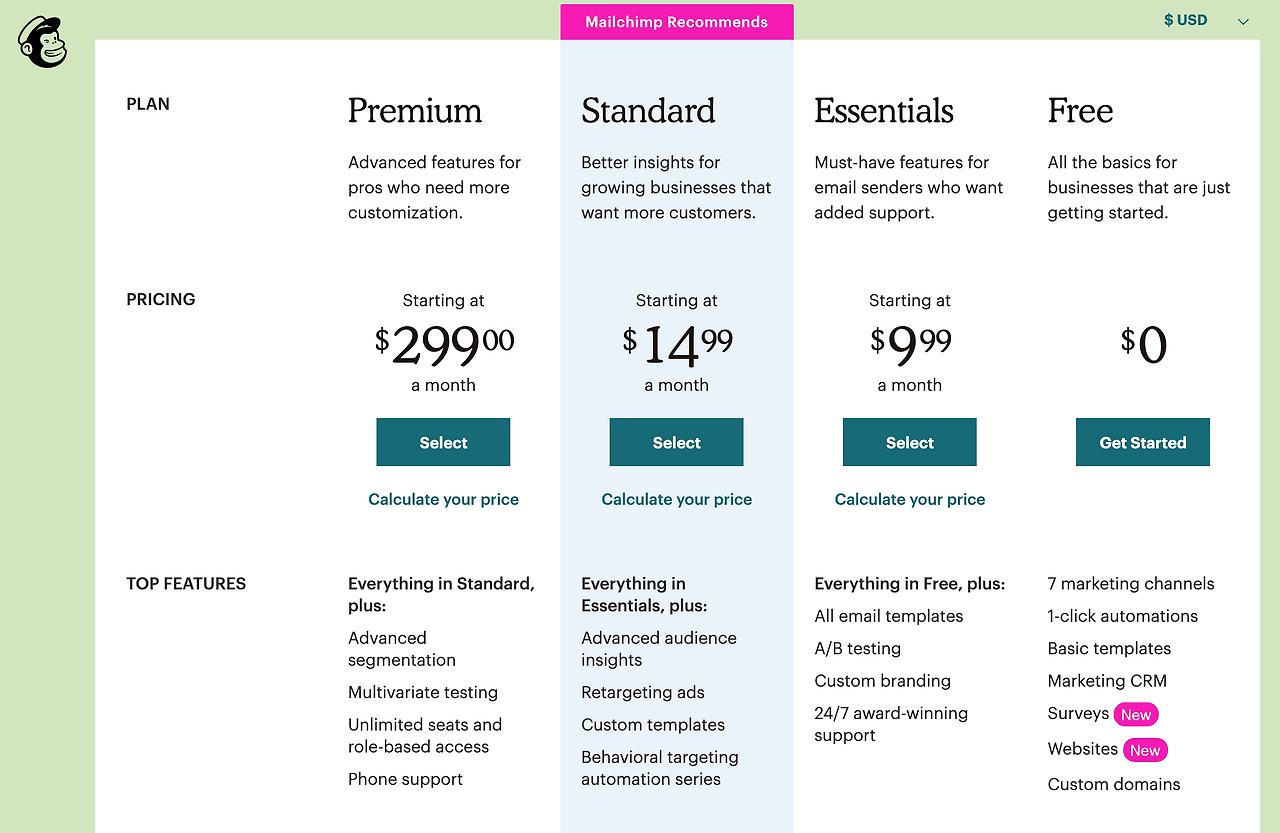 일단 메일침프는 Free - Essentials - Standard - Premium으로 가격 체계가 나눠져 있는데, 0 > 9.99 달러 > 14.99달러 > 299달러로, 원화로 환산하면 대략 매월 12,000원 > 18,000원 > 35만 원 정도라고 보면 되겠다.
