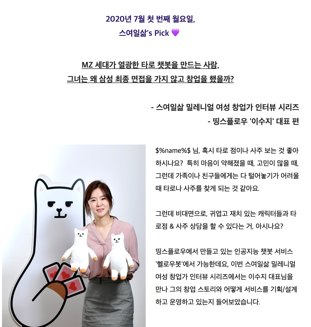 최근에는 여기서 더 나아가 '스여일삶 뉴스레터 서비스에서만 볼 수 있는 컨텐츠가 무엇일까?!'를 고민하여 여성 창업가의 이야기를 소개하거나, 특정 스타트업에 대해 심도 있게 다루면서 그 회사에 다니고 있는 스여일삶 멤버를 짧게 인터뷰 하는 형태의 컨텐츠도 시도해보았다.