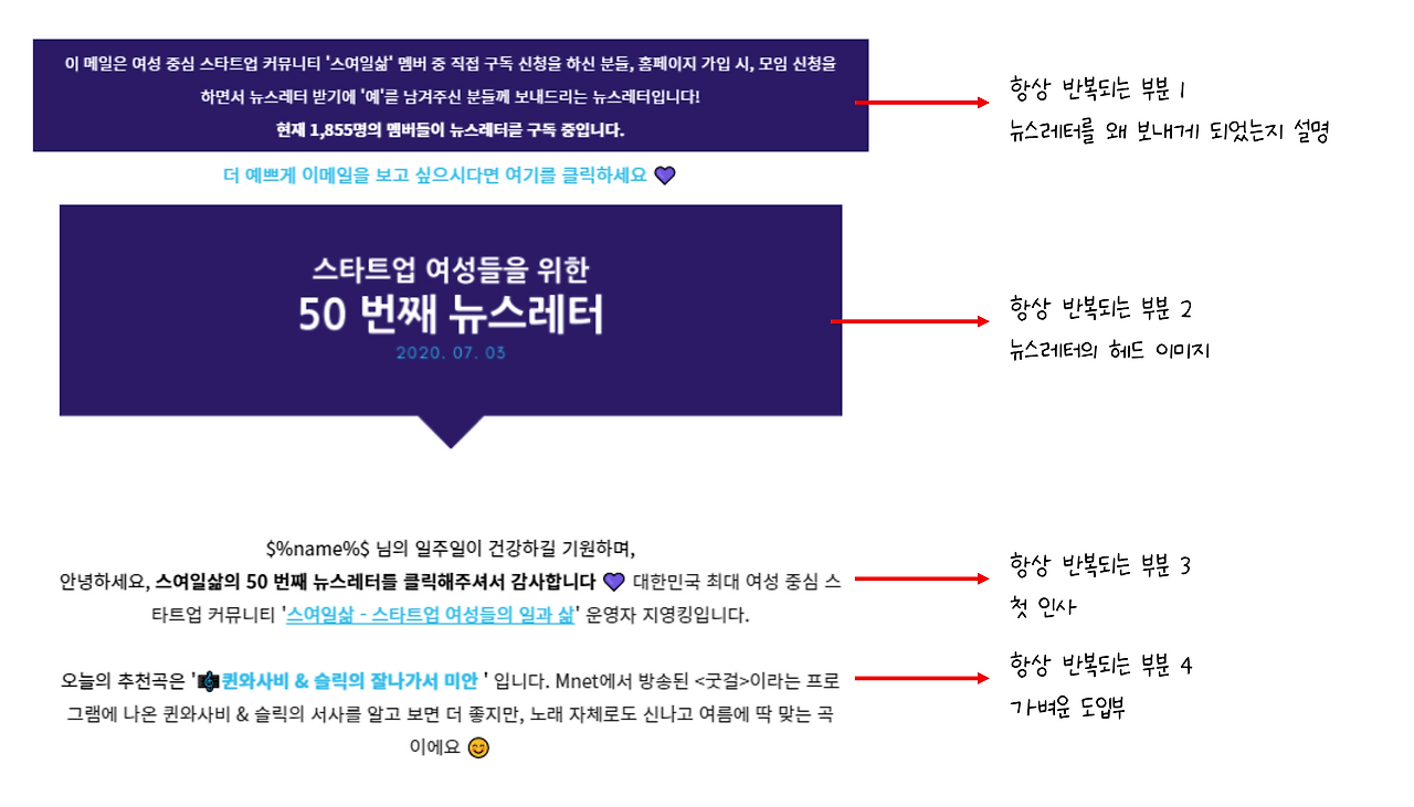 뉴스레터 역시 이와 같은 포맷을 따르되, 그 안의 내용물만 바뀌는 것이기 때문에 반복되는 멘트 + 변화를 줘야 하는 파트를 나눠서 생각해 볼 수 있다.
