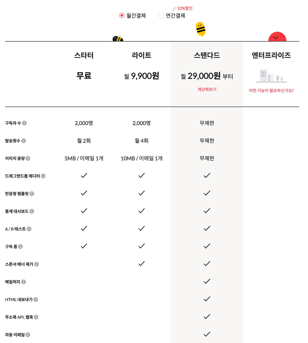 스티비 같은 경우에는 스타터 > 라이트 > 스탠다드 > 엔터프라이즈로 나누어져 있고, 스탠다드의 경우 구독자 수의 구간 별로 요금제가 달라진다. 0-5,000명 / 5,001-10,000명 / 10,001-25,000명 / 25,001-50,000명 / 50,001-100,000명... 이런 식으로 나뉘어져 있다.