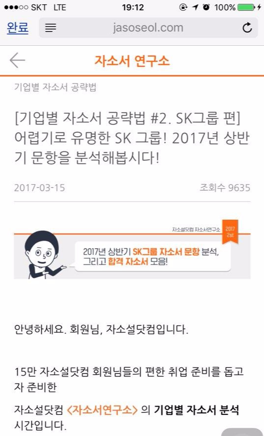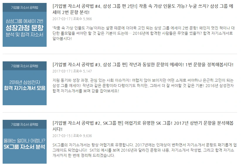 이런 고민을 가지고 만들었던 컨텐츠 중에 가장 잘 되었던 사례는 위의 캡쳐인 <인재상 키워드에 맞게 쓴 자기소개서 샘플> 이다.